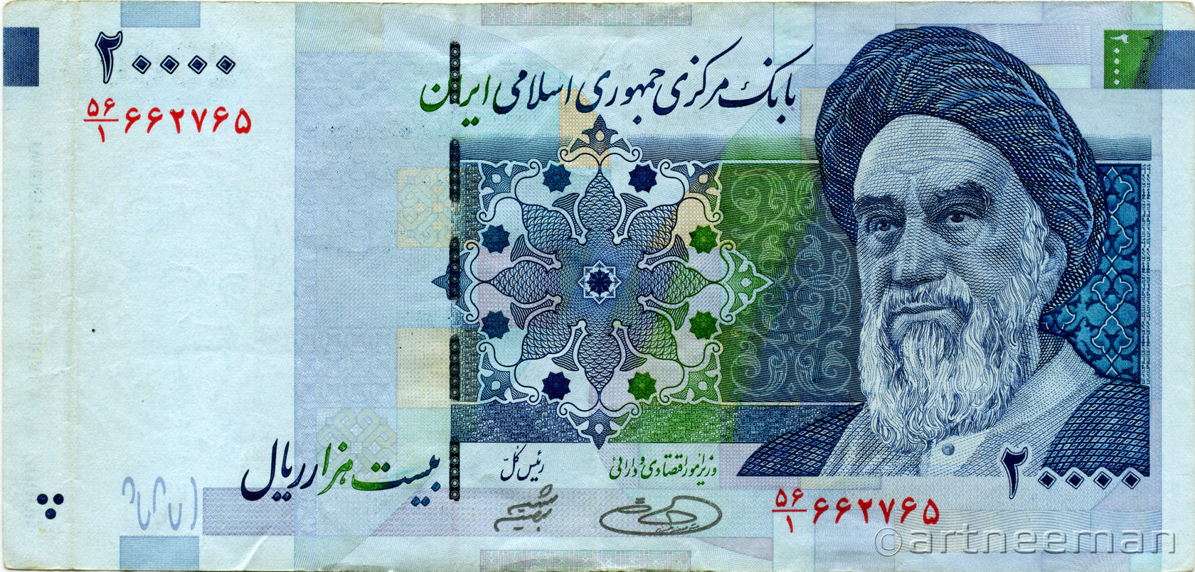 Водяной знак: Портрет Аятоллы Хомейни - Сейи́д Рухолла́ Мостафави́ Мусави́ Хомейни́ или Има́м Хомейни́ — иранский религиозный, духовный, государственный и политический деятель, великий аятолла, лидер исламской революции 1979 года в Иране. Высший руководитель Ирана с 1979 по 1989 год.