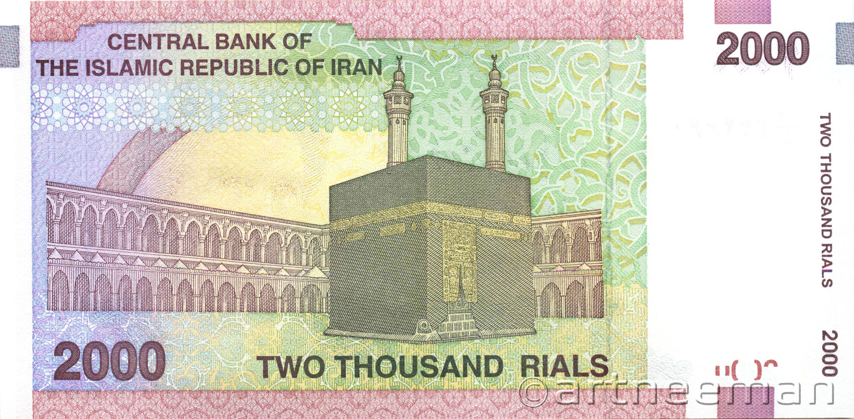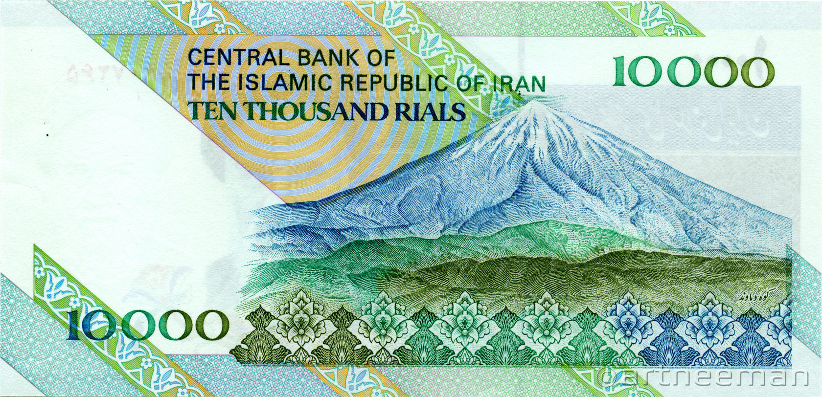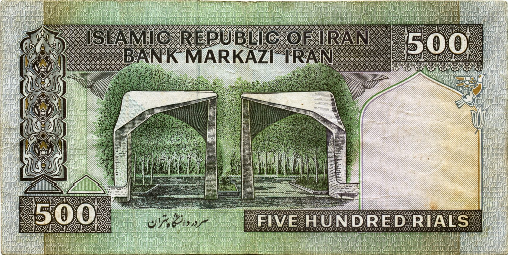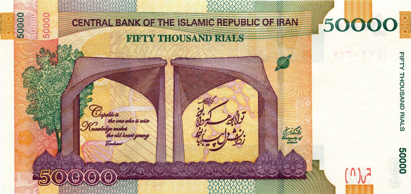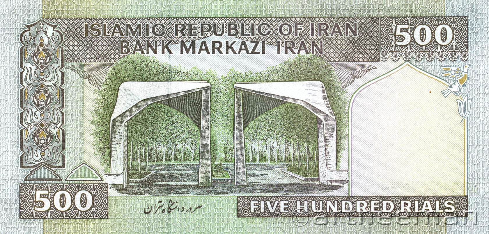 Оборотная сторона: Ворота главный входа Тегеранского университета, разработаны в 1965 году Корошом Фарзами, одного из студентов факультета изобразительных искусств университета. Со временем эти ворота стали символом системы высшего образования Ирана. Цитата "Capable is the one who is wise Knowledge makes the old heart young" - "Тот мощи достигнет, кто знания достиг; От знания душой молодеет старик". Фирдоуси.