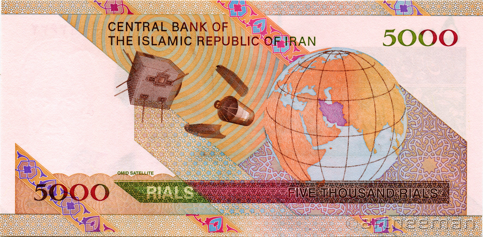 Оборотная сторона: Спутник "Омид", ракета-носитель "Сафир" и глобус. Оми́д (перс. امید, «Надежда») — второй исследовательский и телекоммуникационный спутник Ирана, первый запущенный самостоятельно. Сафир (перс. سفير, «Посланник») — семейство ракет-носителей, созданных в Иране. Создана на базе боевой баллистической ракеты средней дальности Шахаб-3/4. Запускаются с космодрома Семнан.