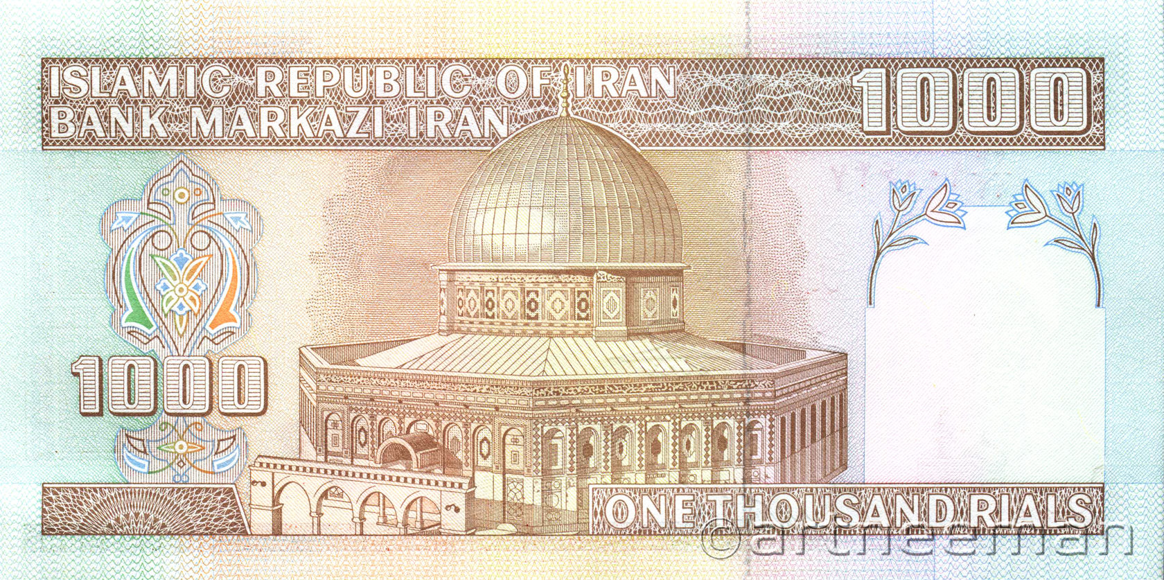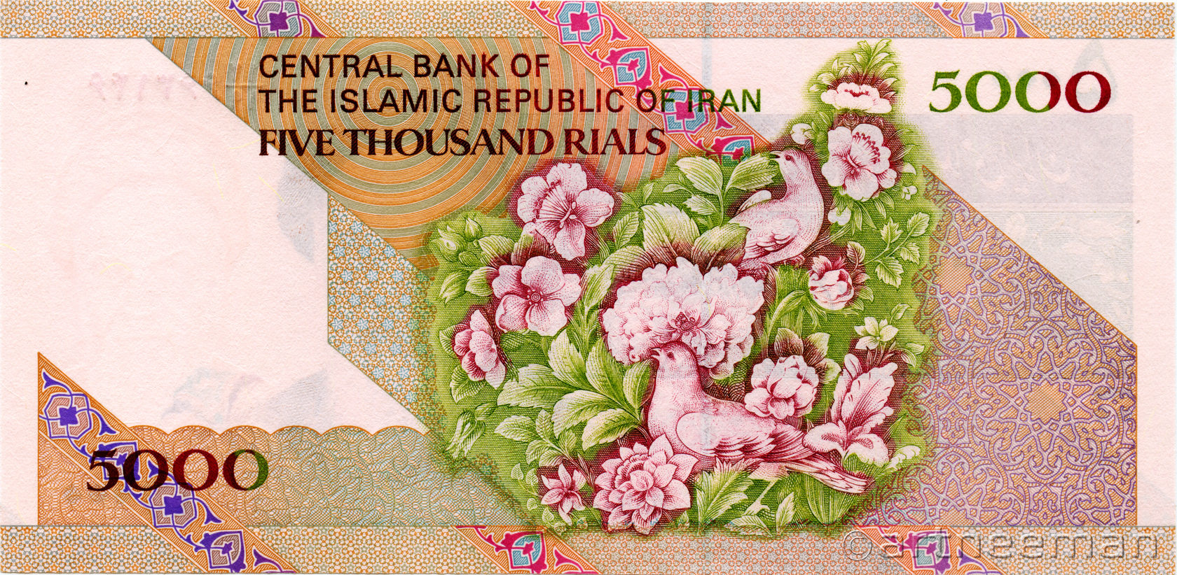 Водяной знак: Герб Ирана - состоит из 4 полумесяцев и сабли. Четыре полумесяца символизируют слово Аллах (на самом деле, есть некоторая схожесть с арабским написанием этого слова). Пять частей герба символизируют пять принципов Ислама. Над саблей - "Ташдид" (похожая на букву W).