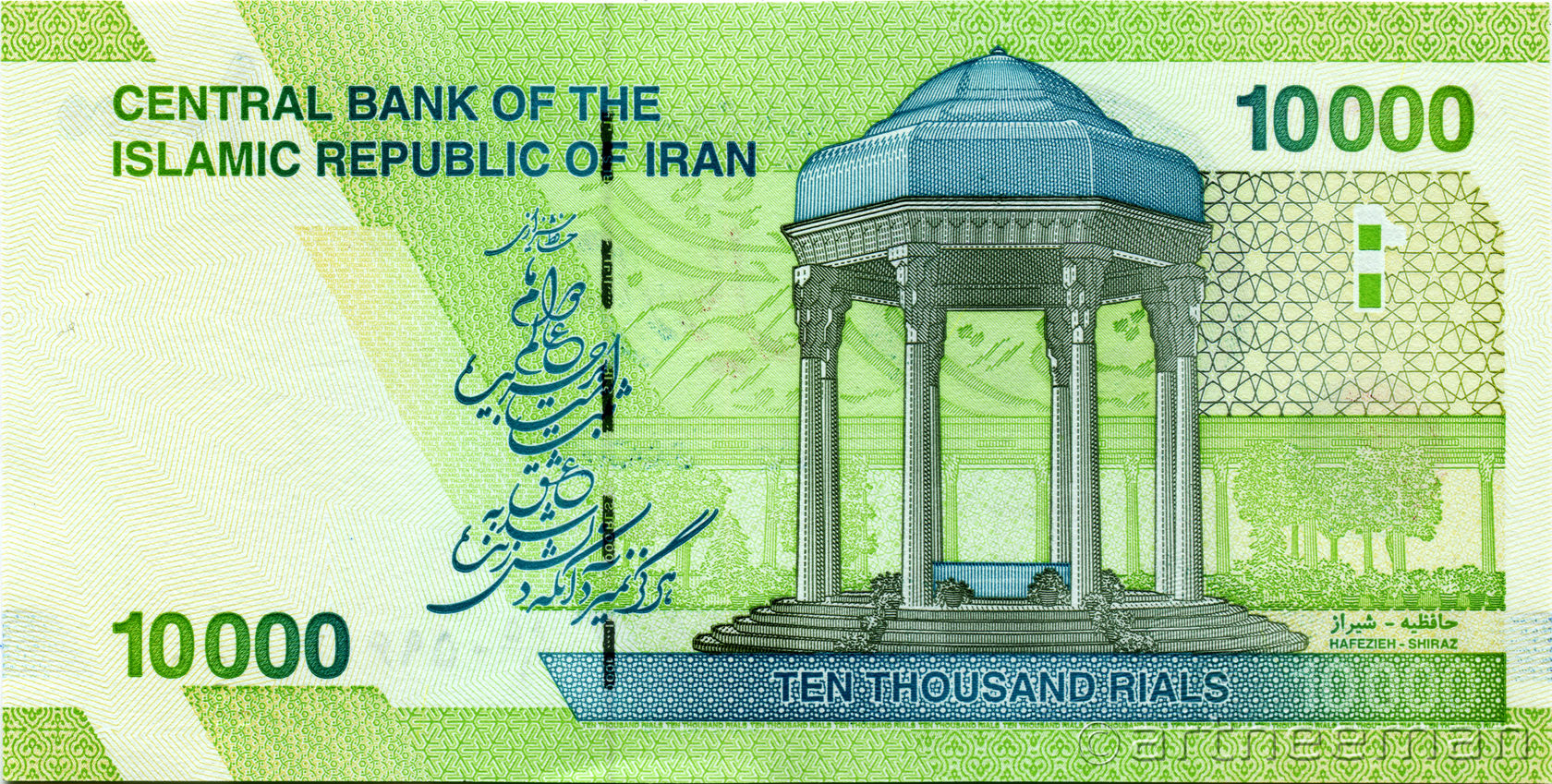 Оборотная сторона: Гробница Хафеза, более известная как Хефезиех (перс.) - предятавляет собой два мемориальных сооружения, возведенные на северной окраине г. Шираза, в память о знаменитом персидском поэте Хафезе. Построена в 1935 году. Хафиз Ширази - Шамсудди́н Муха́ммад Ха́физ Ширази́ (перс. خواجه شمسالدین محمد حافظ شیرازی, также иногда упоминается в источниках как Шамсиддин Мухаммад Хафиз Ширази; ок. 1325—1389/1390) — персидский поэт и суфийский шейх. Его стихи являются вершиной персидской поэзии. В Иране они до сих пор читаются и декламируются. В мактабах (школах) Бухарского ханства в XVI — начале XX века стихи Хафиза Ширази входили в обязательный учебный курс.