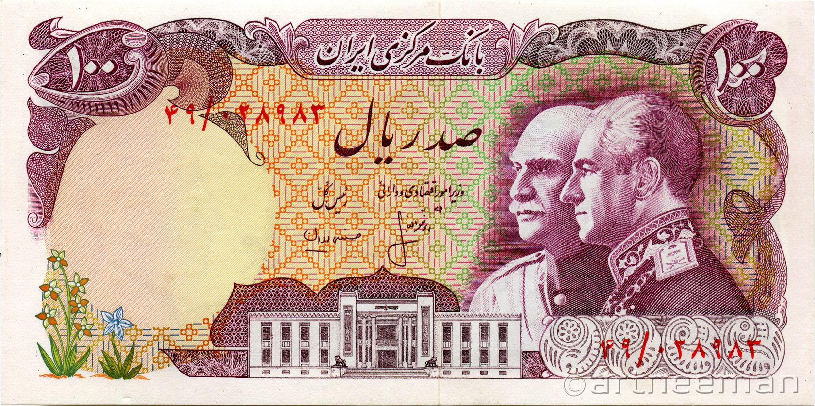 Лицевая сторона: Портрет (9-й тип) Иранские шахи отец и сын Шах Реза Пехлеви и Шах Мухаммад-Реза Пехлеви, Пехлеви I и II-й. Здание национального банк Ирана основан 1927 г.