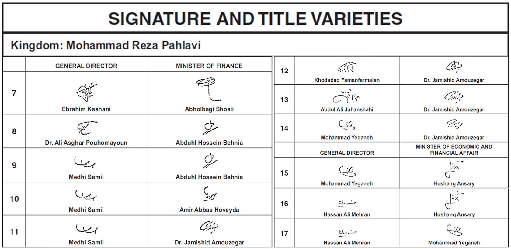 № по Краузе (Pick): [Р 72] Вариант подписей №7: Ebrahim Kashani (глава Центробанка) и Abholbagi Shoaii (министр финансов).