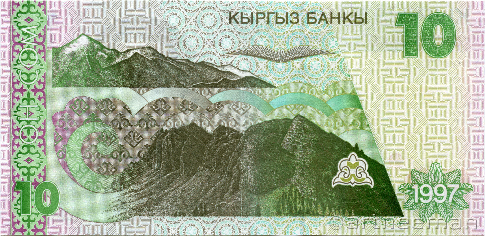Оборотная сторона: Вверху находится текст "КЫРГЫЗ БАНКЫ" и число "10", которое содержит микрошрифт "КЫРГЫЗ БАНКЫ". В центре находится изображение горных хребтов Кыргызстана и урочища Джеты - Огуз. В орнаменте, образующем фоновую сетку, расположен микрошрифт, указывающий на номинал банкноты ("ОН СОМ"). Слева на вертикальной орнаментальной полосе расположено число "10" и текст "ОН СОМ". Справа - сквозной регистр и год выпуска банкноты "1997".