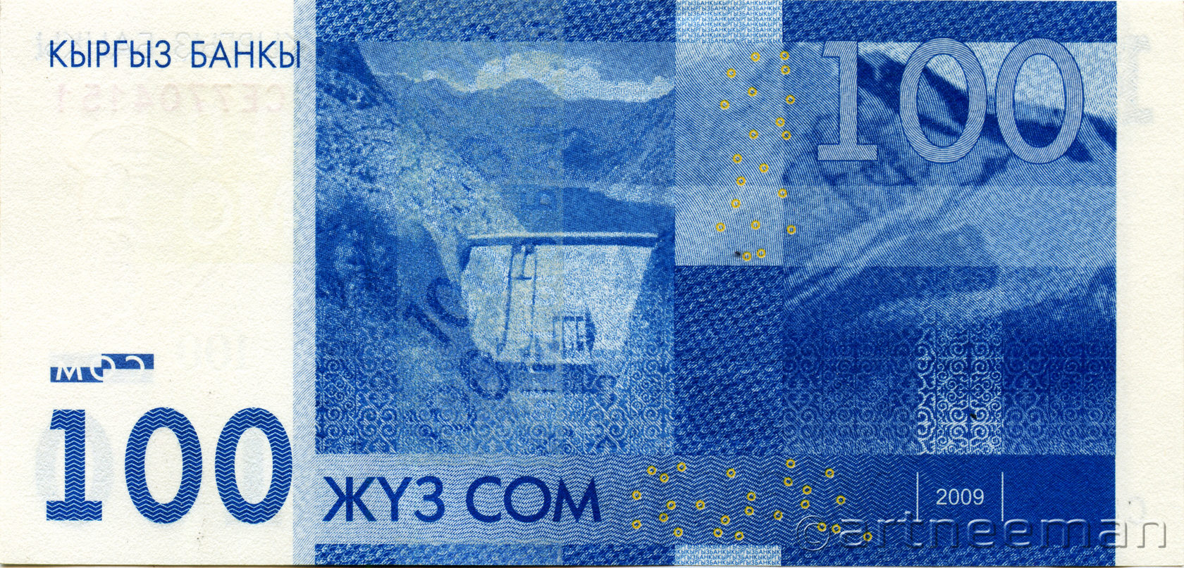 Оборотная сторона: Вверху банкноты находится надпись “КЫРГЫЗ БАНКЫ”. В правом верхнем углу расположены цифры номинала “100”. В центре банкноты изображена Токтогульская ГЭС. Основное сюжетное изображение состоит из стилизованных микроизображений животных. Каждое архитектурное сооружение на банкнотах всей серии расположено на фоне красивейших вершин Кыргызстана, символизирующих, что персонажи, изображенные на банкнотах, достигли вершин в своей деятельности – литературе, музыке, кино, художественном искусстве. В центре банкноты находится иридесцентная (выполненная полупрозрачной блестящей краской) полоса с повторяющимся номиналом “100” и надписью “КЫРГЫЗ БАНКЫ”. Внизу банкноты расположен цифровой номинал “100”, текст “ЖYЗ СОМ” и год выпуска банкноты “2009”.