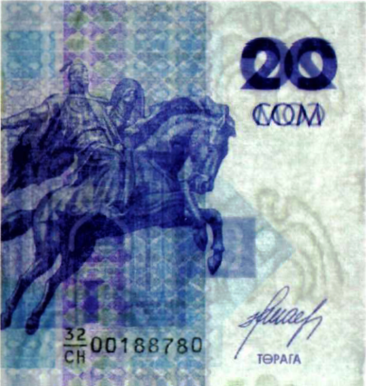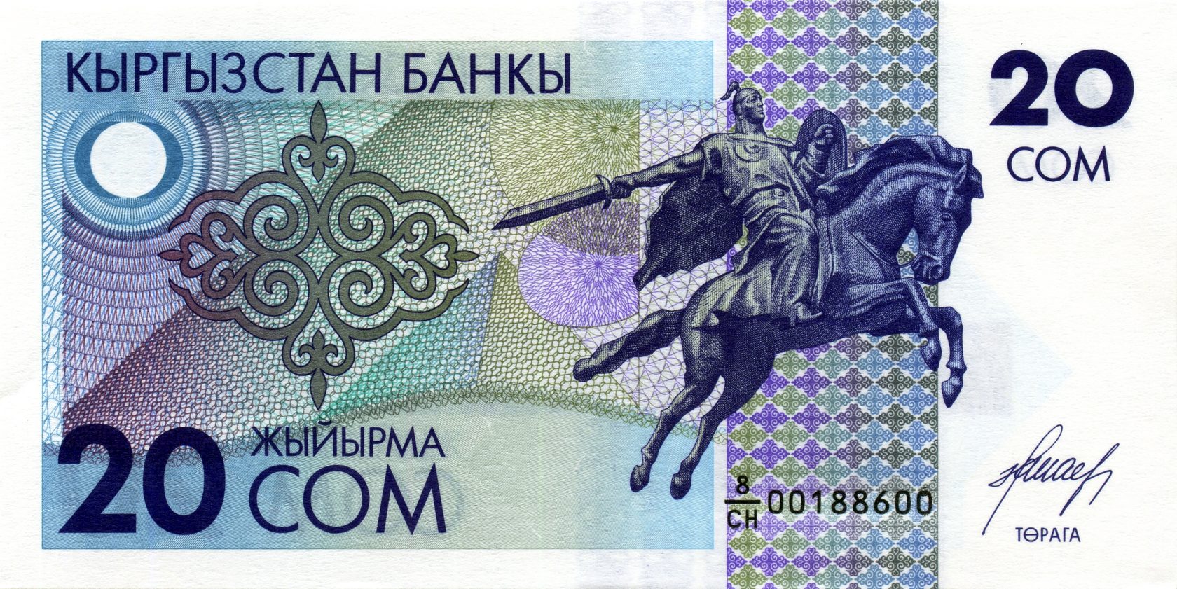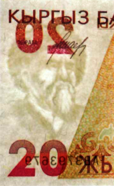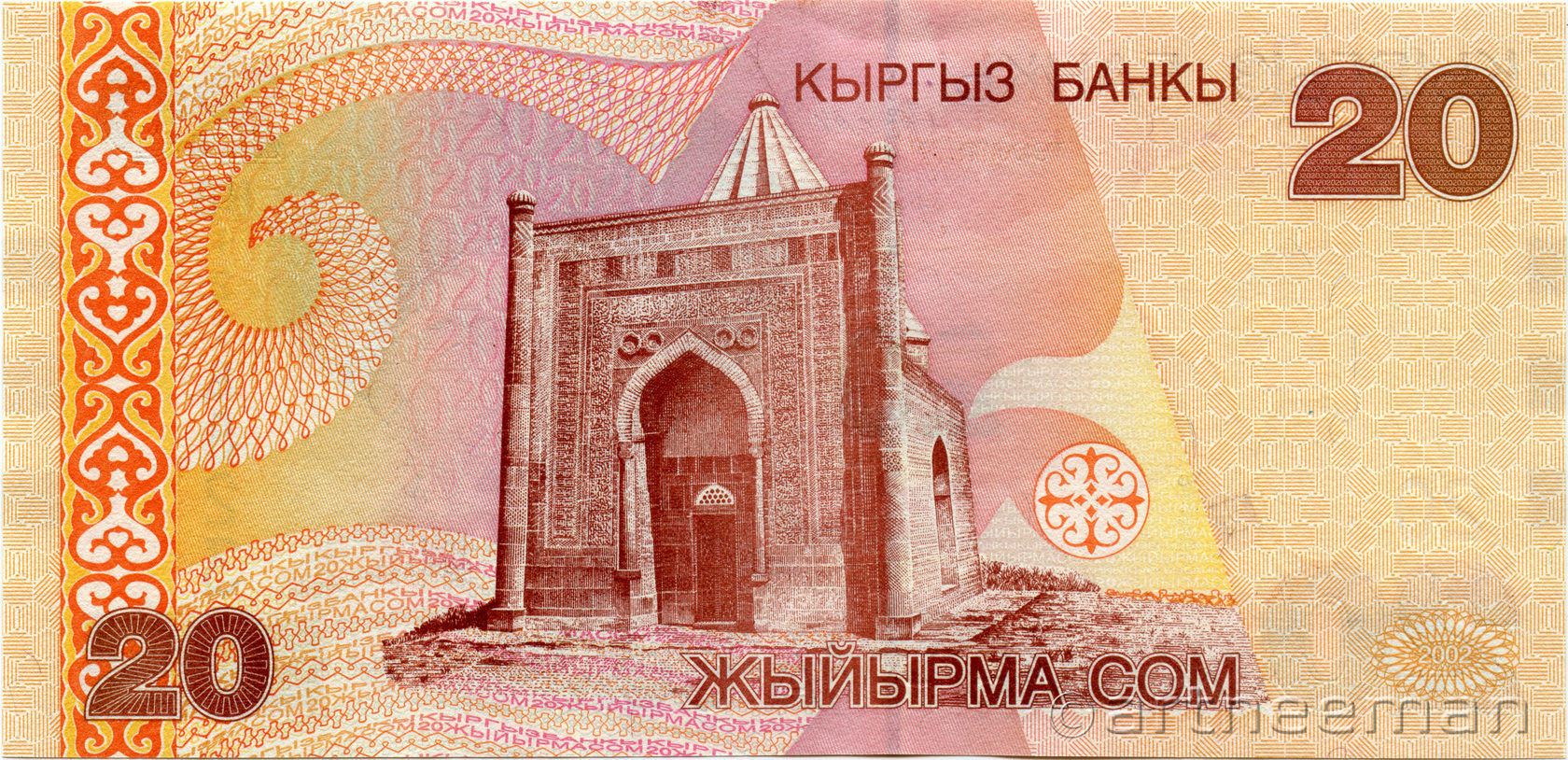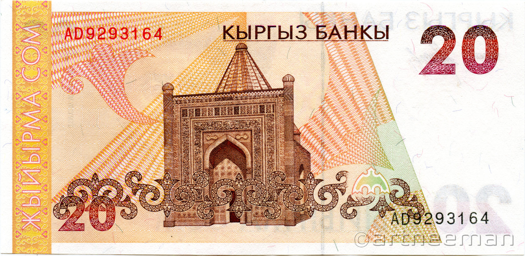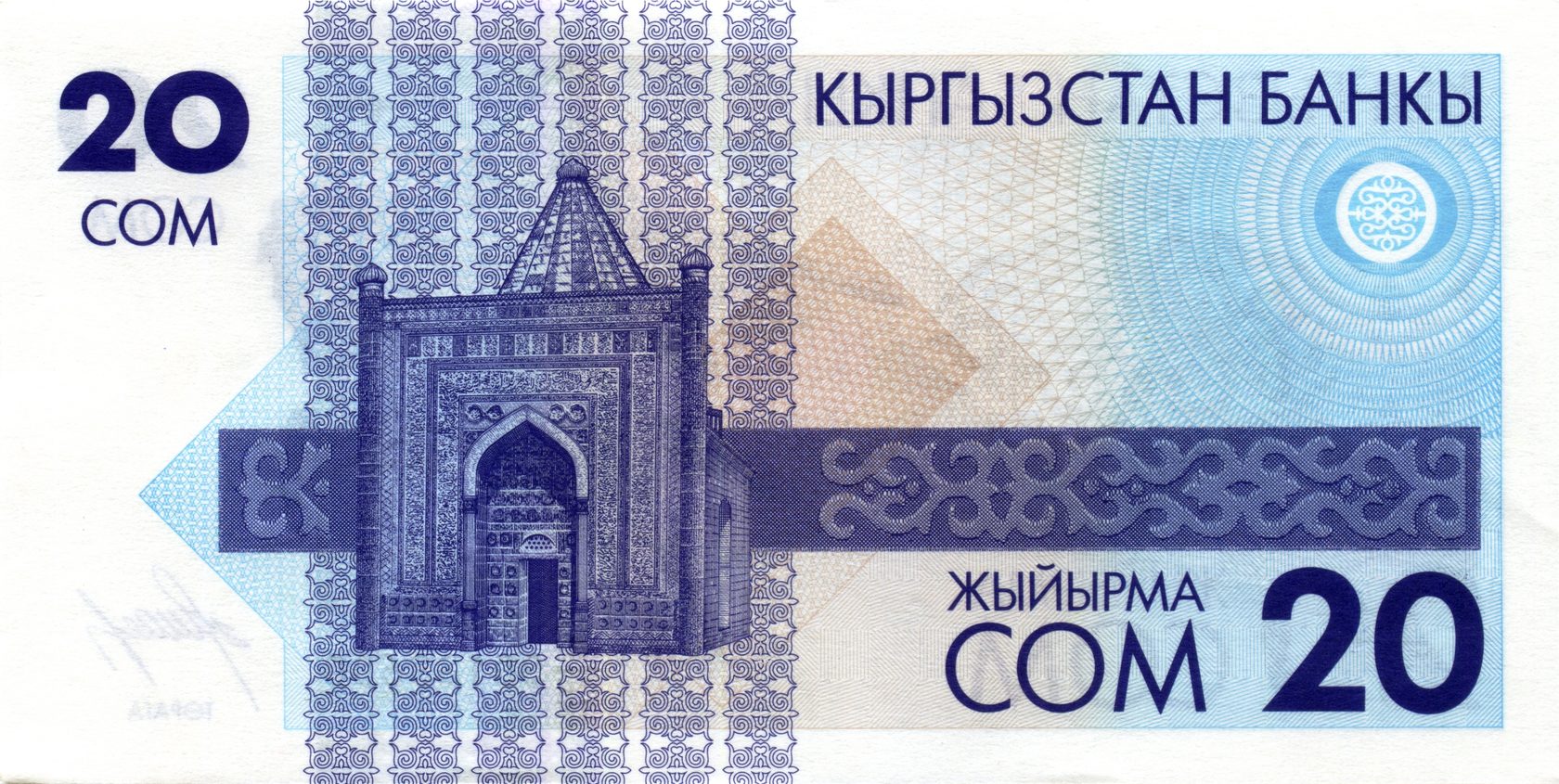 Оборотная сторона: Вверху находятся серийный номер, отпечатанный красной краской; текст "КЫРГЫЗ БАНКЫ", подчеркнутый линией микрошрифта с надписью "КЫРГЫЗ БАНКЫ" и число "20". В центре изображен Мавзолей Манаса (XIV в). Внизу находятся число "20" и серийный номер, отпечатанный черной краской. Слева на вертикальной орнаментальной полосе расположен текст "ЖЫЙЫРМА СОМ".