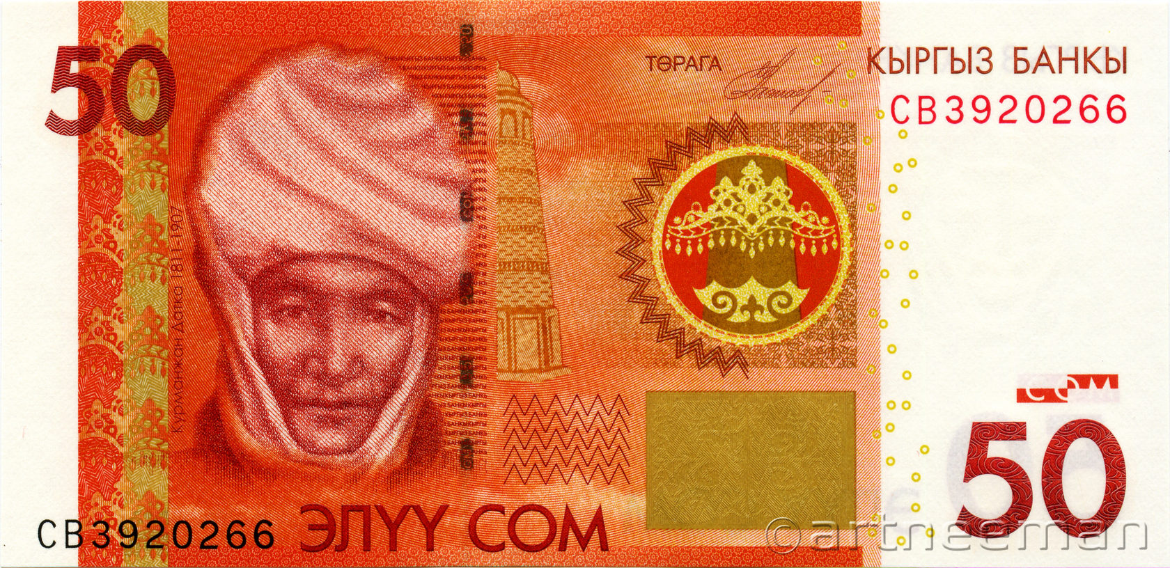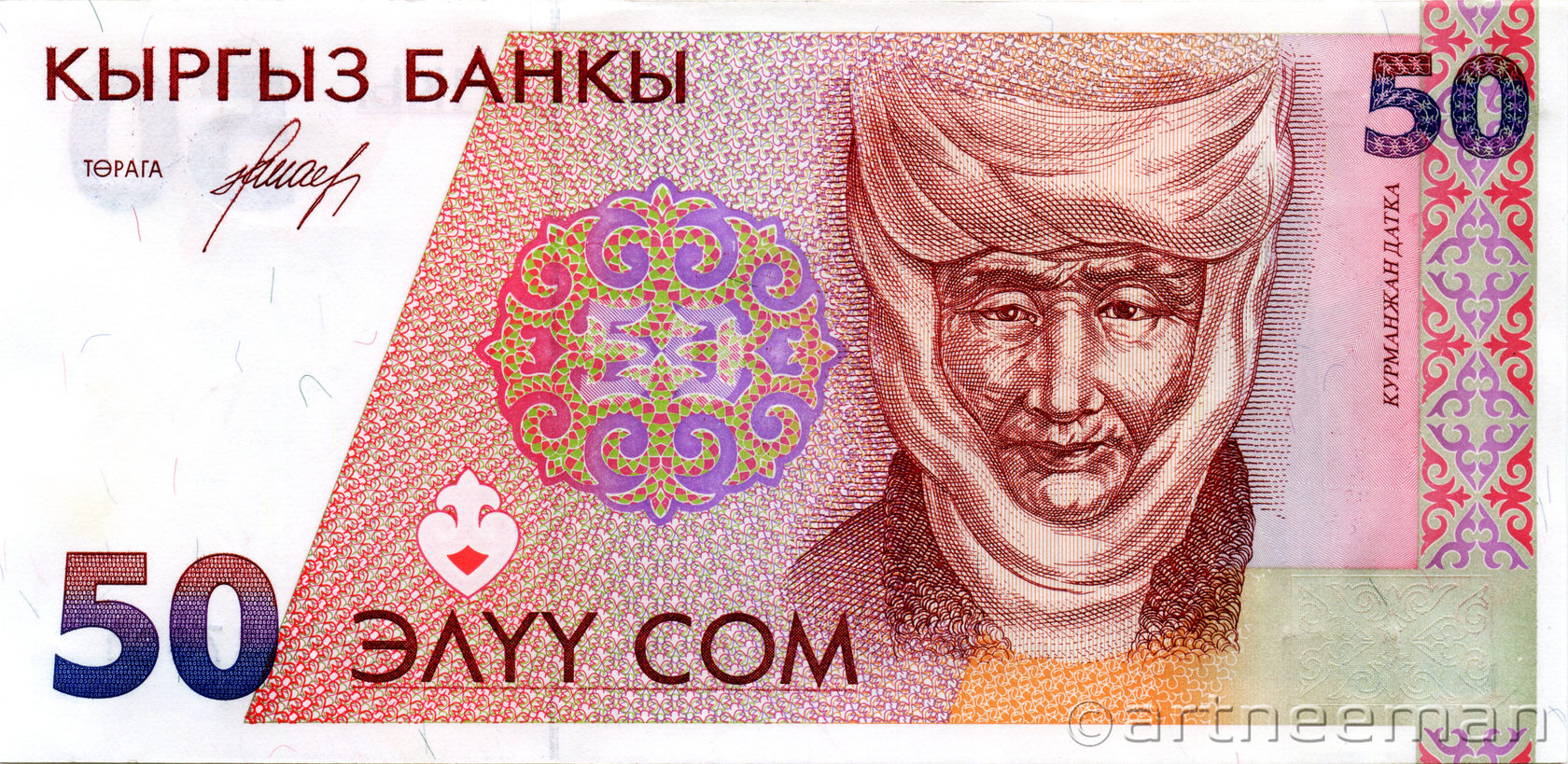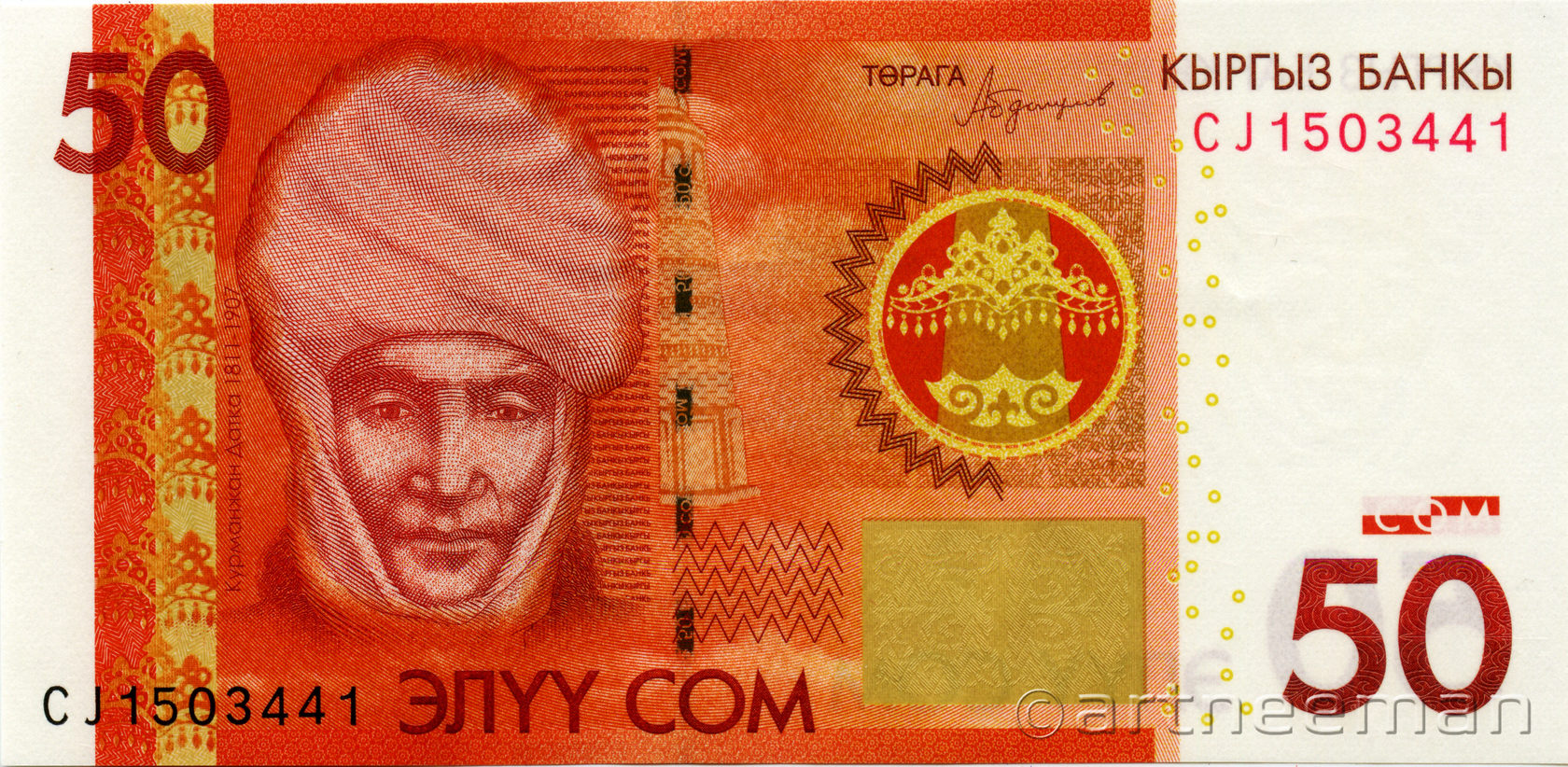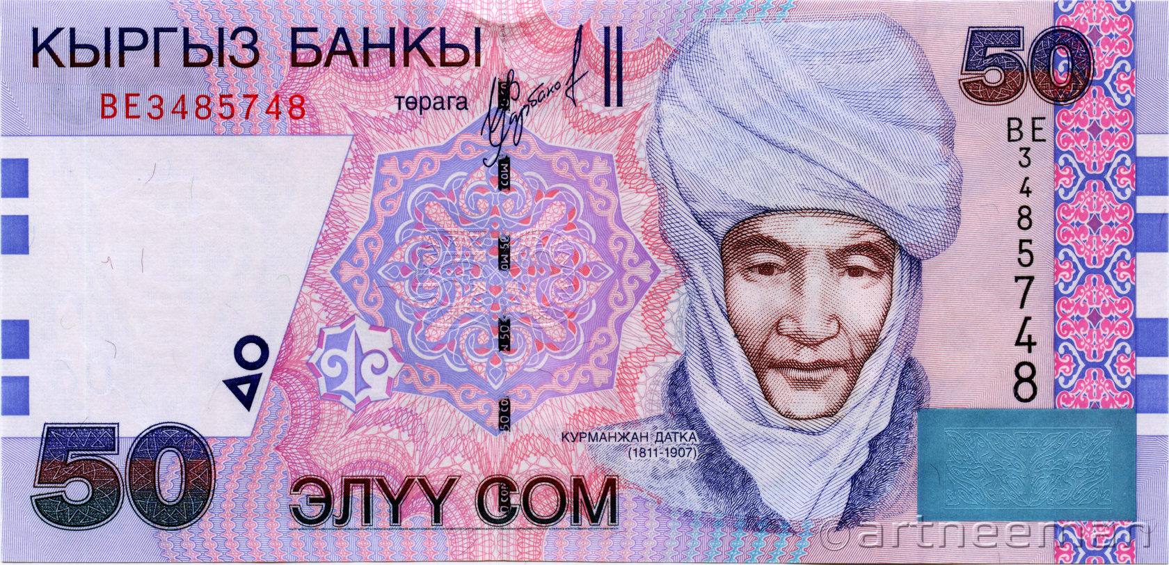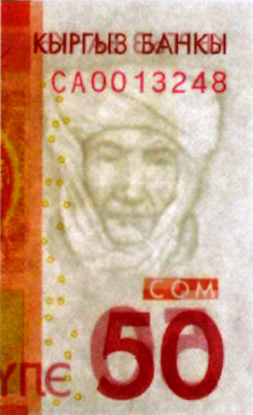 Лицевая сторона: Вверху находятся надпись “КЫРГЫЗ БАНКЫ”, подпись Председателя (Төрага) Национального банка, серийный номер банкноты, выполненный красной краской. Расположенные на белом поле водяного знака изображения на просвет образуют слово “сом”. В левой части банкноты расположен портрет Курманжан Датки, выдающегося государственного деятеля кыргызского народа, широко известной под именем “Алайская царица”, и надпись “КУРМАНЖАН ДАТКА 1811-1907”. Портрет выполнен видимым при увеличении микрошрифтом многократно повторяющейся надписи “КУРМАНЖАНДАТКА”. В линиях, расположенных справа от портрета, при увеличении видна повторяющаяся надпись “КЫРГЫЗБАНКЫ”. Справа от портрета изображен минарет Узгенского архитектурного комплекса. Под портретом расположен текст “ЭЛYY СОМ”. В верхнем левом и нижнем правом углах расположены цифры номинала “50”. В правой нижней части находится желтый прямоугольник, содержащий рельефное изображение национального орнамента. Если его рассматривать под разными углами, можно увидеть скрытое изображение цифрового номинала “50”. В нижнем левом углу расположен серийный номер, выполненный черной краской.