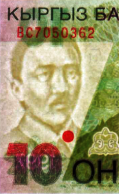 Лицевая сторона: Вверху находится текст "КЫРГЫЗ БАНКЫ" и подпись Председателя (Төрага) НБКР с повышенным рельефом, серийный номер банкноты, выполненный красной краской и число "10". В центре внутри орнамента размещено выполненное серебристой краской изображение номинала "10"; портрет Касыма Тыныстанова - первого кыргызского профессора, автора первых учебников по кыргызскому языку, одного из основоположников кыргызской письменной литературы - и надпись "КАСЫМ (1901-1938)". Портрет и надписи на банкноте шероховаты на ощупь. На белом купонном поле расположена условная метка в виде геометрической фигуры с повышенным рельефом для людей с ослабленным зрением. Справа расположен серийный номер, выполненный черным цветом, размер цифр возрастает сверху вниз. Внизу расположены цифры "10", содержащее микрошрифт из непрерывных рядов чисел "10"; текст "ОН СОМ", который подчеркнут линией микрошрифта "КЫРГЫЗ БАНКЫ", и сквозной регистр в форме орнамента.