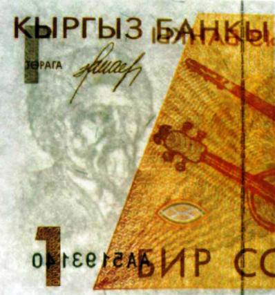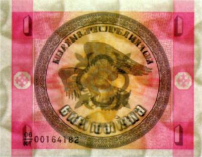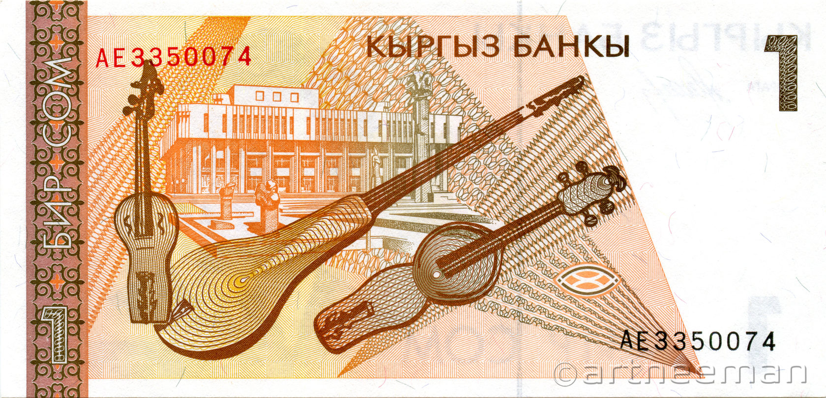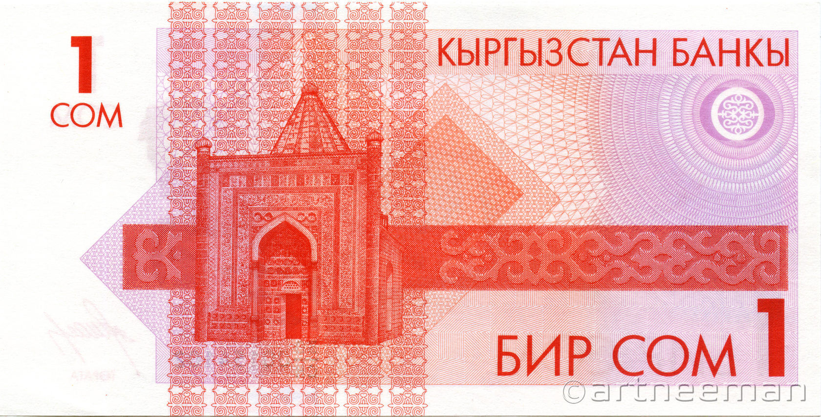 Оборотная сторона: Вверху находится серийный номер, отпечатанный красной краской, текст "КЫРГЫЗ БАНКЫ" и цифра "1". В центре находится изображение кыргызских национальных инструментов: комуза и кылкыяка на фоне здания Кыргызской Государственной филармонии. Внизу - серийный номер, отпечатанный черной краской. Слева на вертикальной орнаментальной полосе расположена цифра "1" и текст "БИР СОМ".