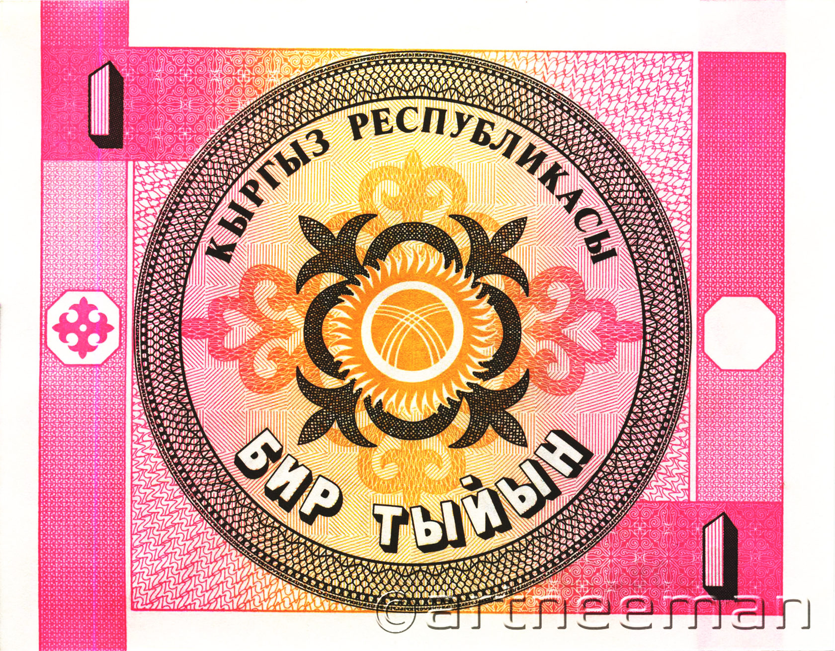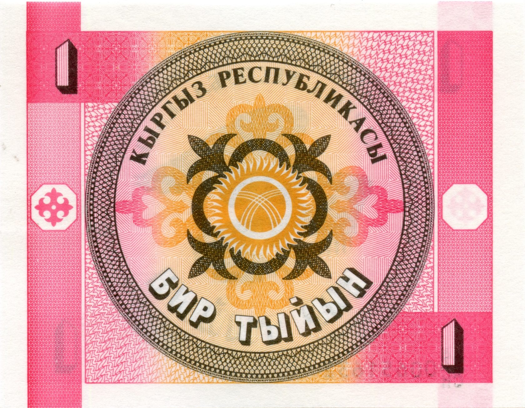 Оборотная сторона: В левом верхнем и правом нижнем углу изображен цифровой номинал банкноты - число 1. В центре - изображение национальной символики (солнца, тyндyк) в орнаментальном круге. В круге находится надпись "Кыргыз Республикасы" и словесный номинал "Бир тыйын". По краям орнаментального круга расположен микротекст "Кыргыз Республикасы". Слева и справа от изображения беркута расположен сквозной регистр.
