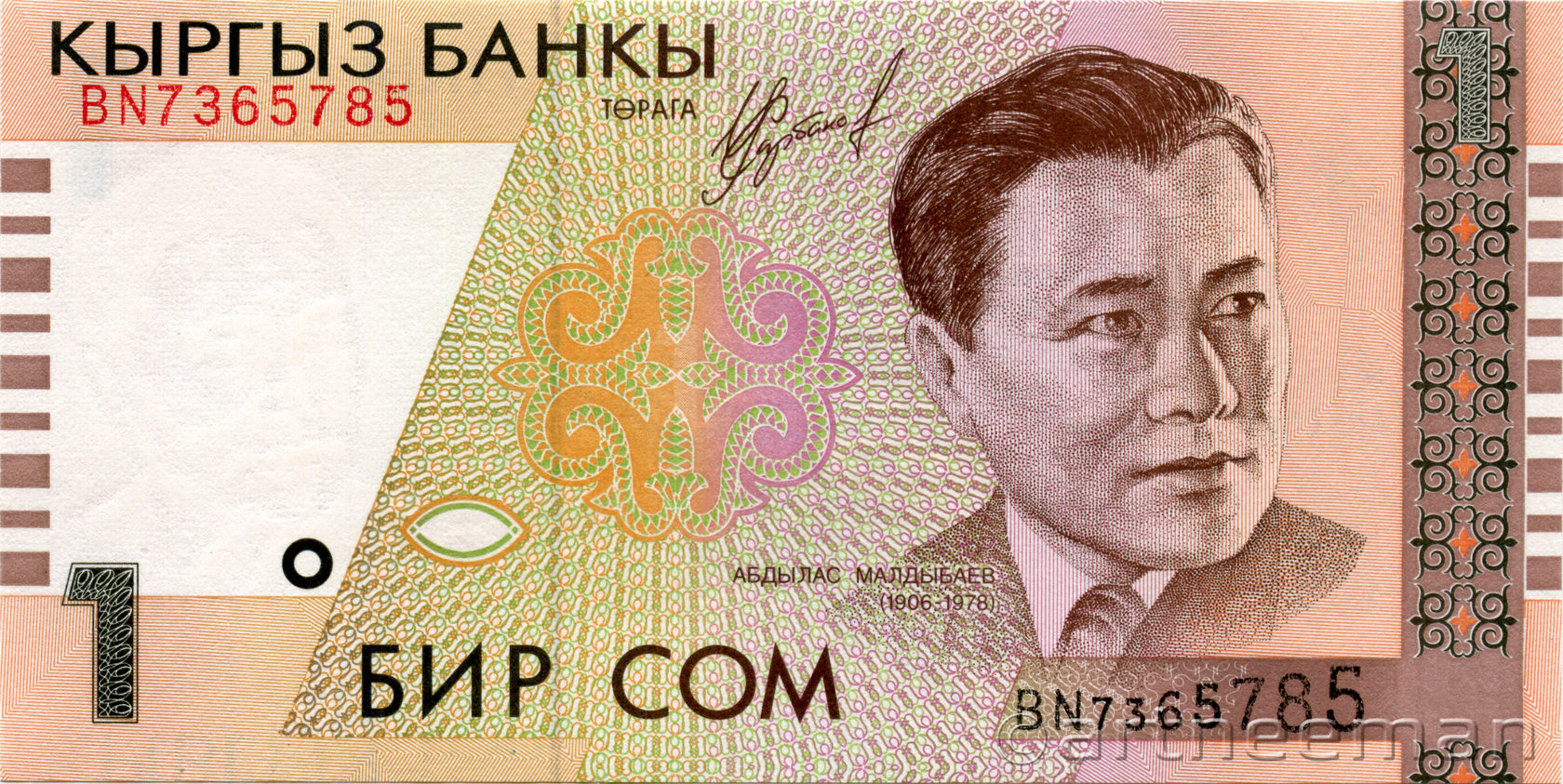 Лицевая сторона: Вверху находится текст "КЫРГЫЗ БАНКЫ" и подпись Председателя (Төрага) НБКР; номинал банкноты "1". В центре в национальном орнаменте расположен цифровой номинал банкноты; справа - портрет Абдыласа Малдыбаева - первого кыргызского композитора и исполнителя - и надпись "АБДЫЛАС". Внизу расположена цифра "1"; текст "БИР СОМ". Внизу слева - сквозной регистр в форме эллипса. Справа расположена вертикальная орнаментальная полоса.