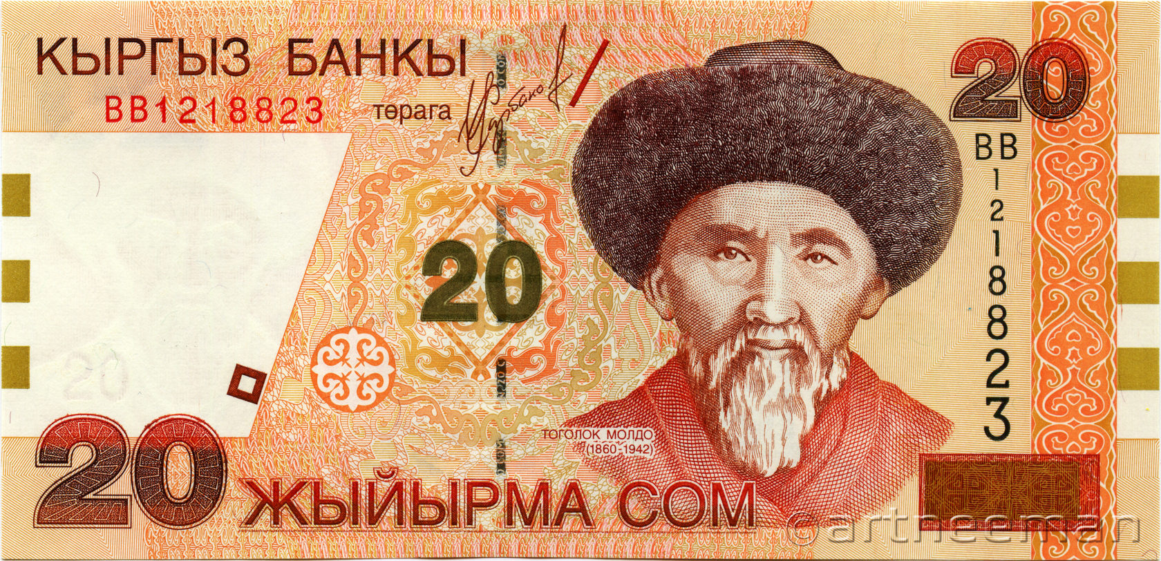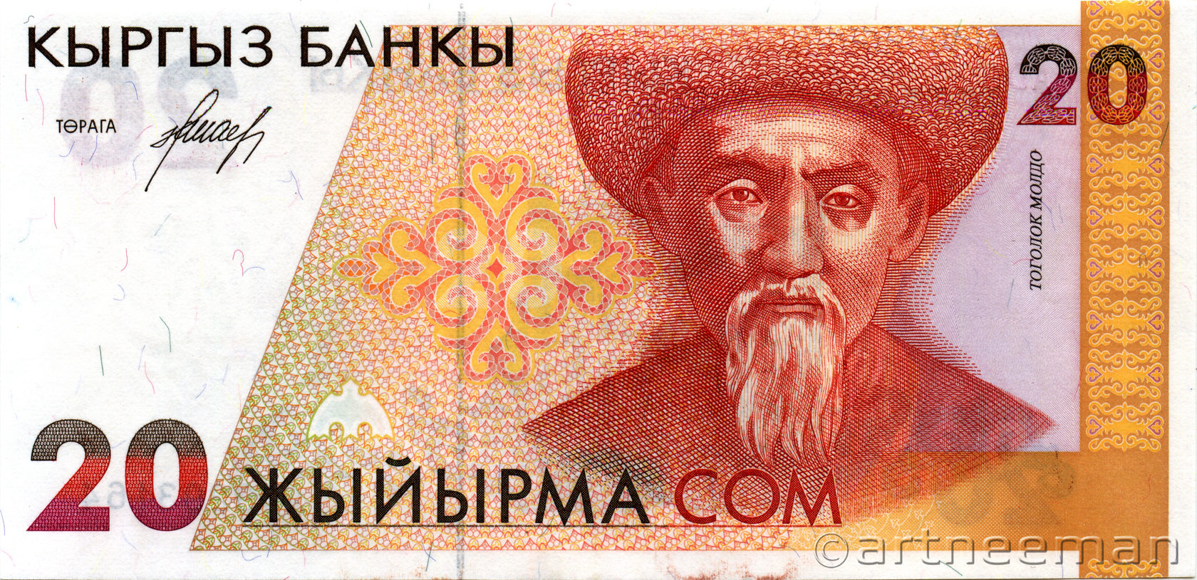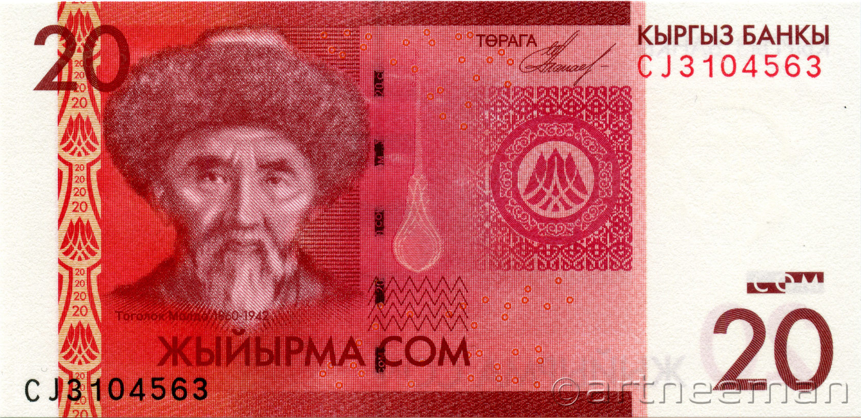 Лицевая сторона: Вверху находятся текст "КЫРГЫЗ БАНКЫ", подпись Председателя (Төрага) НБКР, серийный номер банкноты, выполненный красной краской. Расположенные на белом поле водяного знака совмещающиеся изображения на просвет образуют слово "сом". В левой части банкноты расположен портрет Тоголока Молдо - акына-письменника, поэта, просветителя - и надпись "Тоголок Молдо 1860-1942". Портрет выполнен видимым при увеличении микрошрифтом многократно повторяющейся надписи "Тоголок Молдо". В линиях, расположенных справа от портрета, при увеличении видна повторяющаяся надпись "Кыргыз Банкы". Справа от портрета изображен комуз. Под портретом расположен текст "ЖЫЙЫРМА СОМ". В верхнем левом и нижнем правом углах расположены цифры номинала "20". В нижнем правом углу расположен серийный номер, выполненный черным цветом.