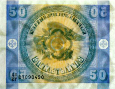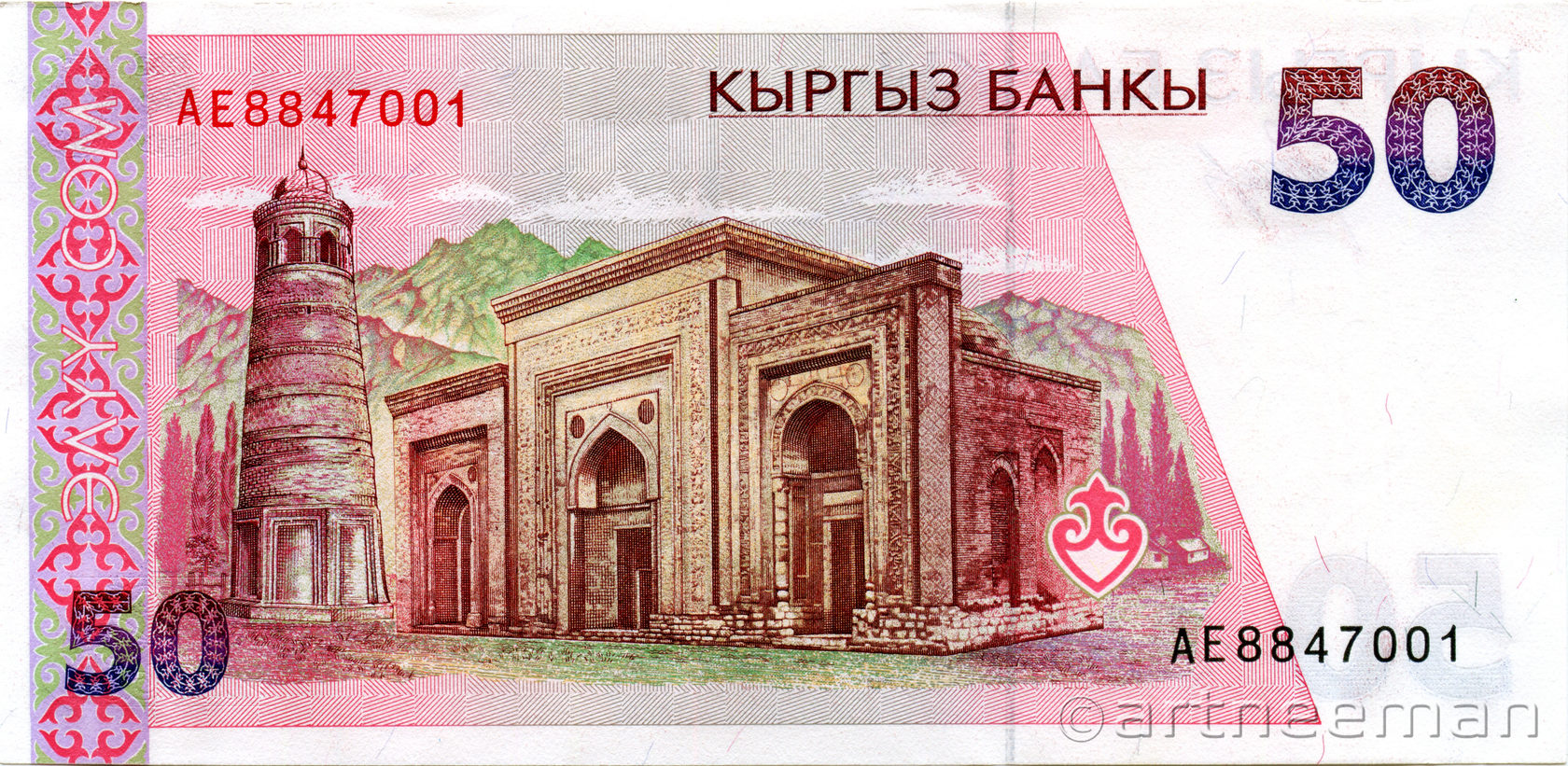 Оборотная сторона: Вверху находятся серийный номер, отпечатанный красной краской; надпись “КЫРГЫЗ БАНКЫ” подчеркнутый линией микрошрифта с надписью “КЫРГЫЗ БАНКЫ” и число “50”. В центре изображен Узгенский архитектурный комплекс 11-12 вв. и сквозной регистр. Внизу - число “50” и серийный номер, отпечатанный черной краской. Слева на вертикальной орнаментальной полосе расположена надпись “ЭЛYY СОМ”.