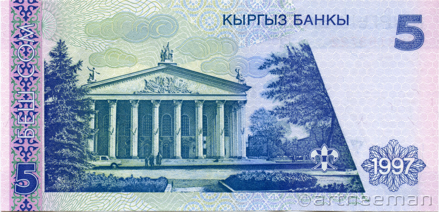 Оборотная сторона: Вверху находится текст "КЫРГЫЗ БАНКЫ" и цифра "5", содержащая микрошрифт "КЫРГЫЗ БАНКЫ". В центре изображен Кыргызский Государственный Академический театр оперы и балета. В орнаменте, образующем фоновую сетку, расположен микрошрифт, указывающий на номинал банкноты ("БЕШ СОМ"). Слева на вертикальной орнаментальной полосе расположена цифра "5" и текст "БЕШ СОМ"; справа - сквозной регистр и год выпуска банкноты "1997" .