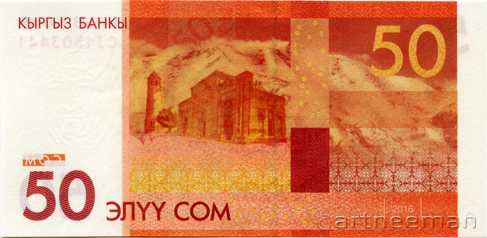 Оборотная сторона: Вверху находится надпись “КЫРГЫЗ БАНКЫ”. В правом верхнем углу расположены цифры номинала “50”. В центре банкноты изображен Узгенский архитектурный комплекс, одно из древнейших сооружений Великого шелкового пути в Кыргызстане. Основное сюжетное изображение состоит из стилизованных микроизображений растений. Каждый архитектурный памятник на банкнотах всей серии расположен на фоне красивейших вершин Кыргызстана, символизирующих, что персонажи, изображенные на банкнотах, достигли вершин в своей деятельности – литературе, музыке, кино, художественном искусстве. В центре банкноты находится иридесцентная (выполненная полупрозрачной блестящей краской) полоса с повторяющимся номиналом “50” и надписью “КЫРГЫЗ БАНКЫ”. Внизу банкноты расположен цифровой номинал “50”, текст “ЭЛYY СОМ” и год выпуска банкноты “2016”.