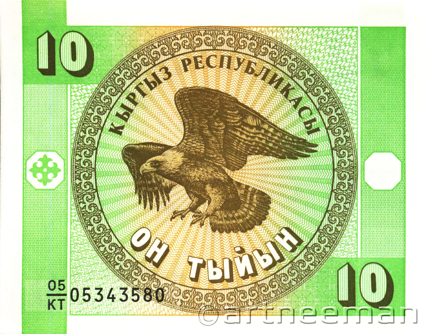 Лицевая сторона: В левом верхнем и правом нижнем углу изображен цифровой номинал - число 10. В центре - парящий беркут на фоне солнечных лучей в орнаментальном круге. В круге находится надпись "Кыргыз Республикасы" и словесный номинал "Он тыйын". По краям орнаментального круга расположен микротекст "Кыргыз Республикасы". Слева и справа от изображения беркута расположен сквозной регистр. В правом нижнем углу расположены серия и номер банкноты, отпечатанные черной краской. Серия состоит из одной цифры и двух букв, номер - из восьми цифр.