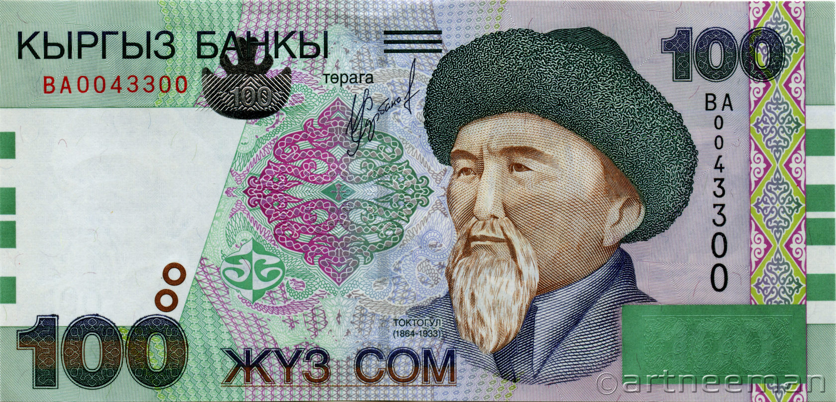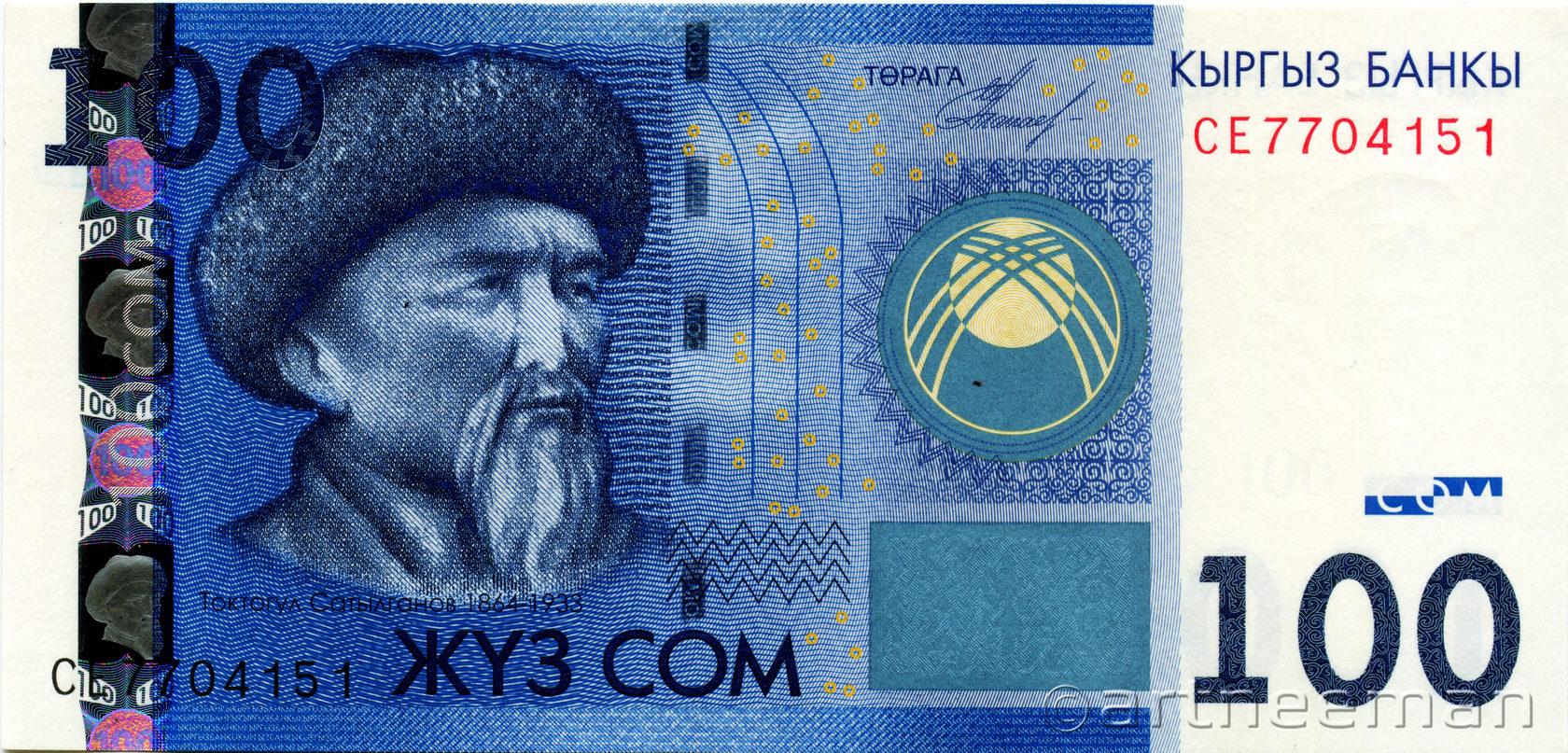 Лицевая сторона: Вверху находятся текст “КЫРГЫЗ БАНКЫ”, подпись Председателя (Төрага) Национального банка, серийный номер банкноты, выполненный красной краской. Слева от портрета расположена голографическая полоса, на которой изображены объемный портрет Токтогула Сатылганова и цифры номинала. При повороте банкноты цифры номинала “100” меняются на изображение тундука. На голографической полосе имеется бескрасочное тиснение в виде надписи “100 сом”, появляющееся при наклоне банкноты. Расположенные на белом поле водяного знака изображения на просвет образуют слово “сом”. В левой части банкноты расположен портрет Токтогула Сатылганова, выдающегося кыргызского акына-демократа, мыслителя, и надпись “ТОКТОГУЛ САТЫЛГАНОВ 1864-1933’. Портрет выполнен видимым при увеличении микрошрифтом многократно повторяющейся надписи “ТОКТОГУЛСАТЫЛГАНОВ”. В линиях, расположенных справа от портрета, при увеличении видна повторяющаяся надпись “КЫРГЫЗ БАНКЫ”. Под портретом – текст “ЖYЗ СОМ”. В верхнем левом и нижнем правом углах расположены цифры номинала “100”. В правой нижней части находится синий прямоугольник, содержащий рельефное изображение национального орнамента. Если его рассматривать под разными углами, можно увидеть скрытое изображение цифрового номинала “100”. В нижнем левом углу расположен серийный номер, выполненный черной краской.