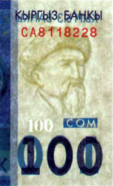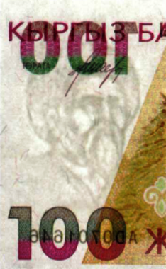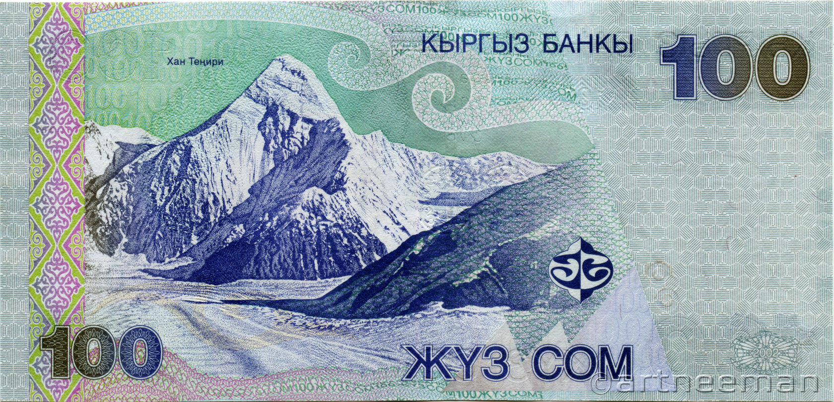 Оборотная сторона: Вверху находятся надпись “КЫРГЫЗ БАНКЫ” и число “100”, которое содержит микрошрифт цифрового номинала “100”. В центре находится изображение величественной горы “Хан-Тенгри”, символизирующей свободу и независимость Кыргызской Республики; справа - сквозной регистр в форме орнамента. В орнаменте, образующем фоновую сетку, расположен микрошрифт, указывающий на номинал банкноты (“ЖYЗ СОМ”) и вертикальная орнаментальная полоса. В левой нижней части банкноты находится иридесцентная полоса с национальным орнаментом, выполненная перламутровой краской. Внизу - цифровой номинал “100”, текст “ЖYЗ СОМ” и год выпуска банкноты “2002”.