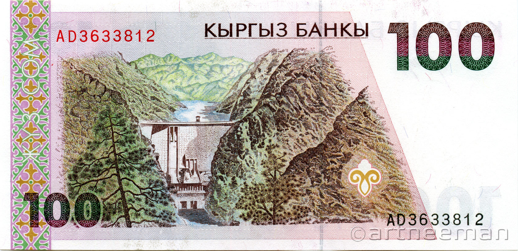 Оборотная сторона: Вверху находятся серийный номер, отпечатанный красной краской; надпись “КЫРГЫЗ БАНКЫ” подчеркнутый линией микрошрифта с надписью “КЫРГЫЗ БАНКЫ” и число “100”. В центре расположены изображение Токтогульской Гидроэлектростанции и сквозной регистр. Внизу - число “100” и серийный номер, отпечатанный черной краской. Слева на вертикальной орнаментальной полосе расположена надпись “ЖYЗ СОМ”.