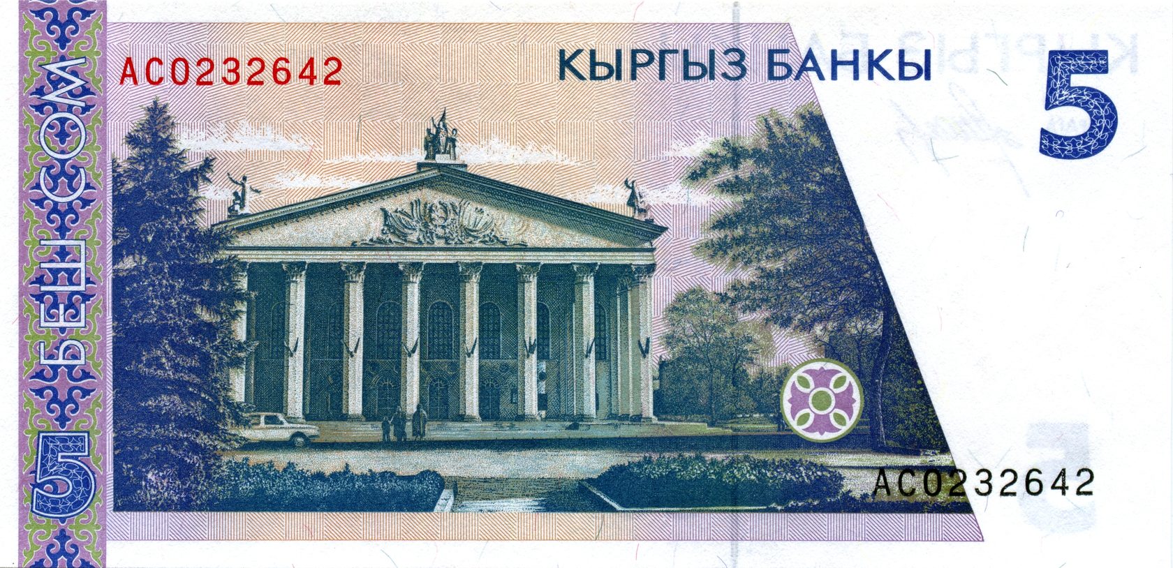 Оборотная сторона: Вверху находится серийный номер, отпечатанный красной краской, текст "КЫРГЫЗ БАНКЫ" и цифра "5". В центре изображен Кыргызский Государственный Академический театр оперы и балета. Внизу - серийный номер, отпечатанный черной краской. Слева на вертикальной орнаментальной полосе расположена цифра "5" и текст "БЕШ СОМ".