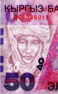 Лицевая сторона: Вверху находятся надпись “КЫРГЫЗ БАНКЫ”, подпись Председателя (Төрага) Национального банка и число “50”. В центре в национальном орнаменте расположен цифровой номинал банкноты; справа - портрет Курманжан Датки, выдающегося государственного деятеля кыргызского народа, широко известной под именем “Алайская царица”, и надпись “КУРМАНЖАН ДАТКА”. В левом нижнем углу расположены цифры “50”, содержащие микрошрифт в виде сплошных рядов числа “50”; текст “ЭЛYY СОМ”, который подчеркнут линией микрошрифта “КЫРГЫЗ БАНКЫ” и сквозной регистр в форме кувшина. Справа от портрета расположена вертикальная орнаментальная полоса. В нижней части находится светло-зеленый прямоугольник, содержащий рельефное изображение национального орнамента. Если его рассматривать под разными углами, можно увидеть скрытое изображение цифрового номинала “50”.
