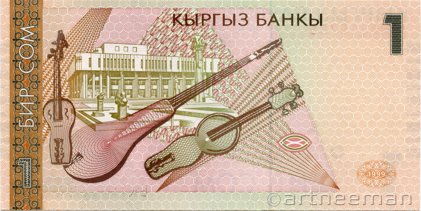 Оборотная сторона: Вверху расположены текст "КЫРГЫЗ БАНКЫ" и цифра "1". В центре находится изображение кыргызских национальных инструментов: комуза и кылкыяка на фоне здания Кыргызской Государственной филармонии в Бишкеке. Справа внизу указан год "1999". Слева на вертикальной орнаментальной полосе расположена цифра "1" и текст "БИР СОМ".
