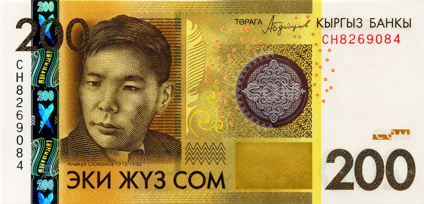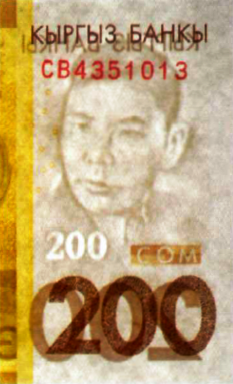 Лицевая сторона: Вверху находятся номинал "200", содержащий микроизображения птиц, подпись Председателя (Төрага) Национального банка, текст "КЫРГЫЗ БАНКЫ", серийный номер банкноты, выполненный красной краской. В левой части банкноты расположен портрет Алыкула Осмонова, кыргызского поэта, драматурга, и надпись "АЛЫКУЛ ОСМОНОВ 1915-1950". Портрет выполнен видимым при увеличении микрошрифтом многократно повторяющейся надписи "АЛЫКУЛОСМОНОВ". Слева от портрета расположена голографическая полоса, на которой изображены надпись "КЫРГЫЗ БАНКЫ", цифры номинала и изображение пера. При повороте банкноты направление пера меняется справа налево. В линиях, расположенных справа от портрета, при увеличении видна повторяющаяся надпись "КЫРГЫЗБАНКЫ". Под портретом текст "ЭКИ ЖYЗ СОМ". На белом купонном поле слева от портрета вертикально расположен серийный номер, выполненный черной краской. Справа от защитной нити рельефное изображение солнца и волн, которое выделяется на фоне желтого круга. Расположенные на белом поле водяного знака изображения на просвет образуют слово “сом”. В правой нижней части находится желтый прямоугольник, содержащий рельефное изображение национального орнамента. При рассмотрении под разными углами, можно увидеть скрытое изображение цифрового номинала "200". В нижнем правом углу расположены цифры номинала "200".