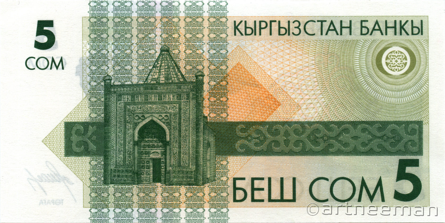 Оборотная сторона: Вверху находится цифра с надписью "5 СОМ" и текст "КЫРГЫЗСТАН БАНКЫ". В центре изображен Мавзолей Манаса (XIV в), по краю горизонтальной орнаментальной полосы проходит надпись микрошрифтом "КЫРГЫЗСТАН БАНКЫ". Справа вверху расположен сквозной регистр. Внизу - текст "БЕШ СОМ 5".