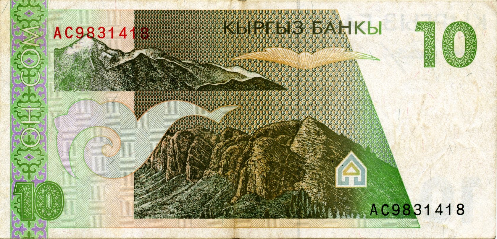 Оборотная сторона: Вверху расположен, отпечатанный красной краской серийный номер, текст "КЫРГЫЗ БАНКЫ" и число "10". В центре находится изображение горных хребтов Кыргызстана и урочища Джеты - Огуз. Справа внизу - серийный номер, отпечатанный черной краской. Слева на вертикальной орнаментальной полосе расположено число "10" и текст "ОН СОМ" .