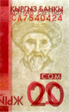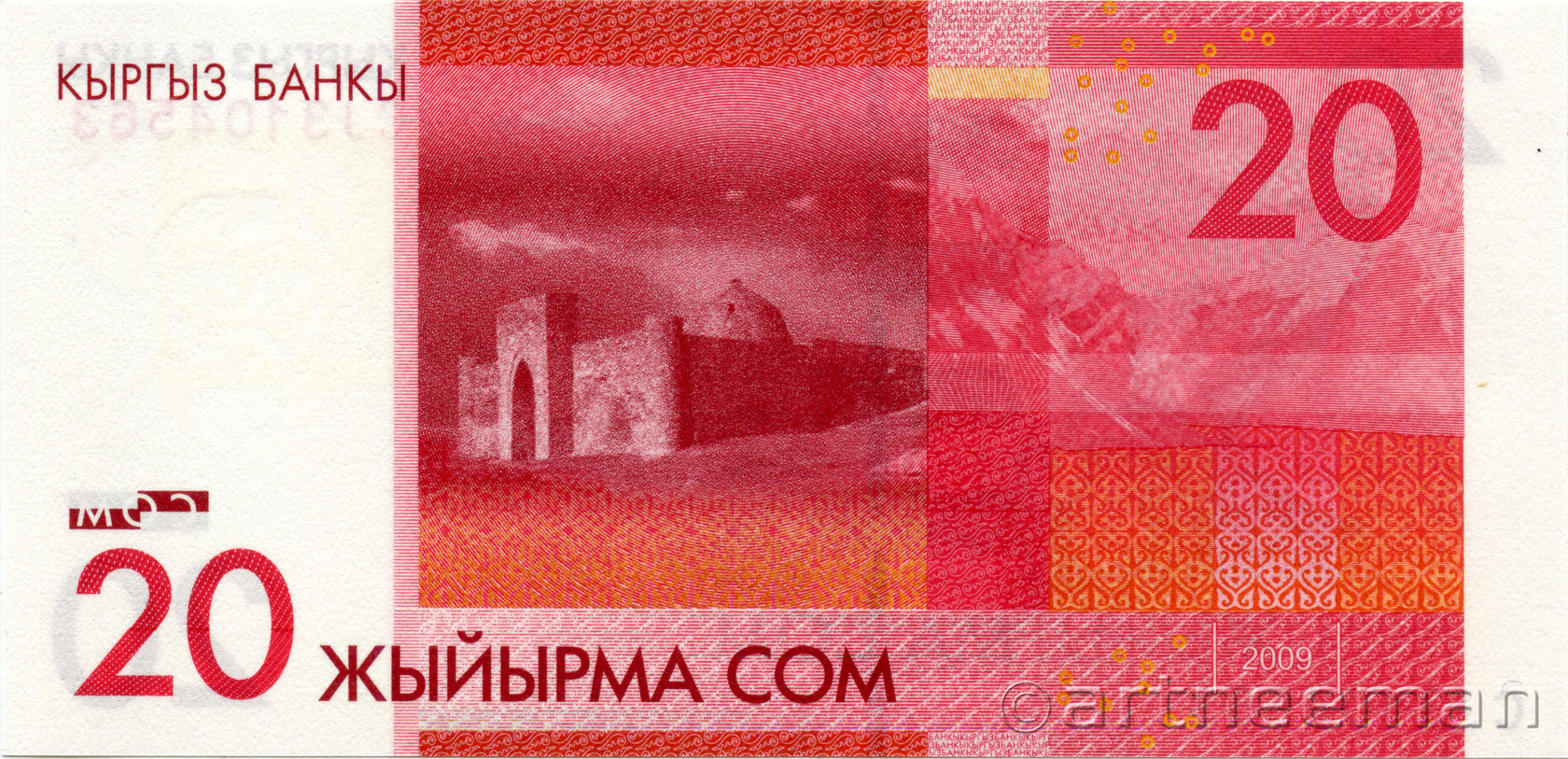 Оборотная сторона: Вверху банкноты находятся текст "КЫРГЫЗ БАНКЫ" и цифры номинала "20". В центре банкноты изображен Таш Рабат, одно из древнейших сооружений Великого шелкового пути в Кыргызстане. Основное сюжетное изображение состоит из стилизованных микроизображений растений. Каждый архитектурный памятник на банкнотах всей серии расположен на фоне красивейших вершин Кыргызстана, символизирующих, что персонажи, изображенные на банкнотах, достигли вершин в своей деятельности " литературе, музыке, кино, художественном искусстве. Внизу банкноты расположен цифровой номинал "20", текст "ЖЫЙЫРМА СОМ" и год выпуска банкноты "2009".