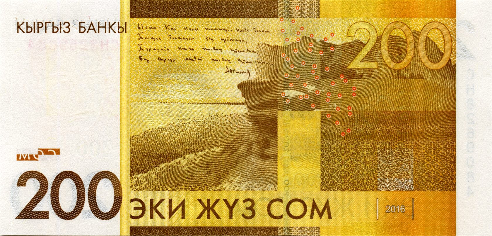 Оборотная сторона: В центе банкноты изображено озеро Иссык-Куль на фоне красивейших вершин Кыргызстана и стихотворные строки А. Осмонова, посвященные озеру. Вверху находится текст “КЫРГЫЗ БАНКЫ” и цифры номинала “200”. В центре банкноты находится иридесцентная (выполненная полупрозрачной блестящей краской) полоса с повторяющимся номиналом “200” и надписью “КЫРГЫЗ БАНКЫ”. Внизу банкноты расположен цифровой номинал "200", надпись "ЭКИ ЖYЗ СОМ" и год выпуска банкноты “2010”.