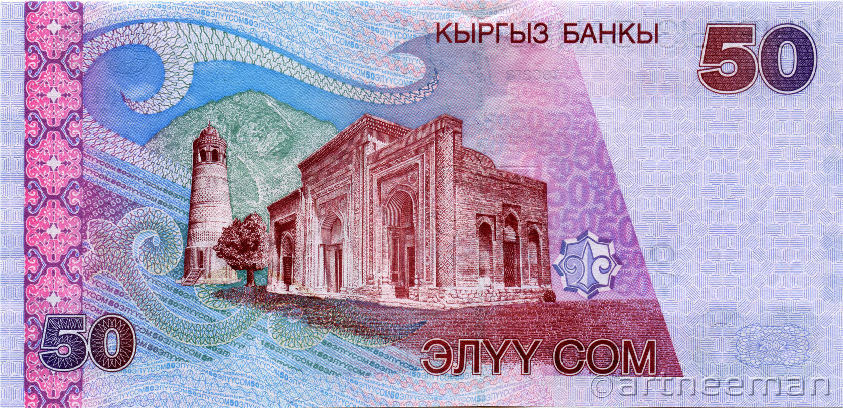Оборотная сторона: Вверху находятся надпись “КЫРГЫЗ БАНКЫ” и число “50”, которое содержит микрошрифт цифрового номинала “50”. В центре изображен Узгенский архитектурный комплекс и сквозной регистр в форме орнамента. Слева находится вертикальная орнаментальная полоса. В орнаменте, образующем фоновую сетку, расположен микрошрифт, указывающий на номинал банкноты (“ЭЛYY СОМ”). В левой нижней части банкноты находится иридесцентная полоса с национальным орнаментом, выполненная перламутровой краской. Внизу указаны цифровой номинал “50”; текст “ЭЛYY СОМ” и год выпуска банкноты “2002”.