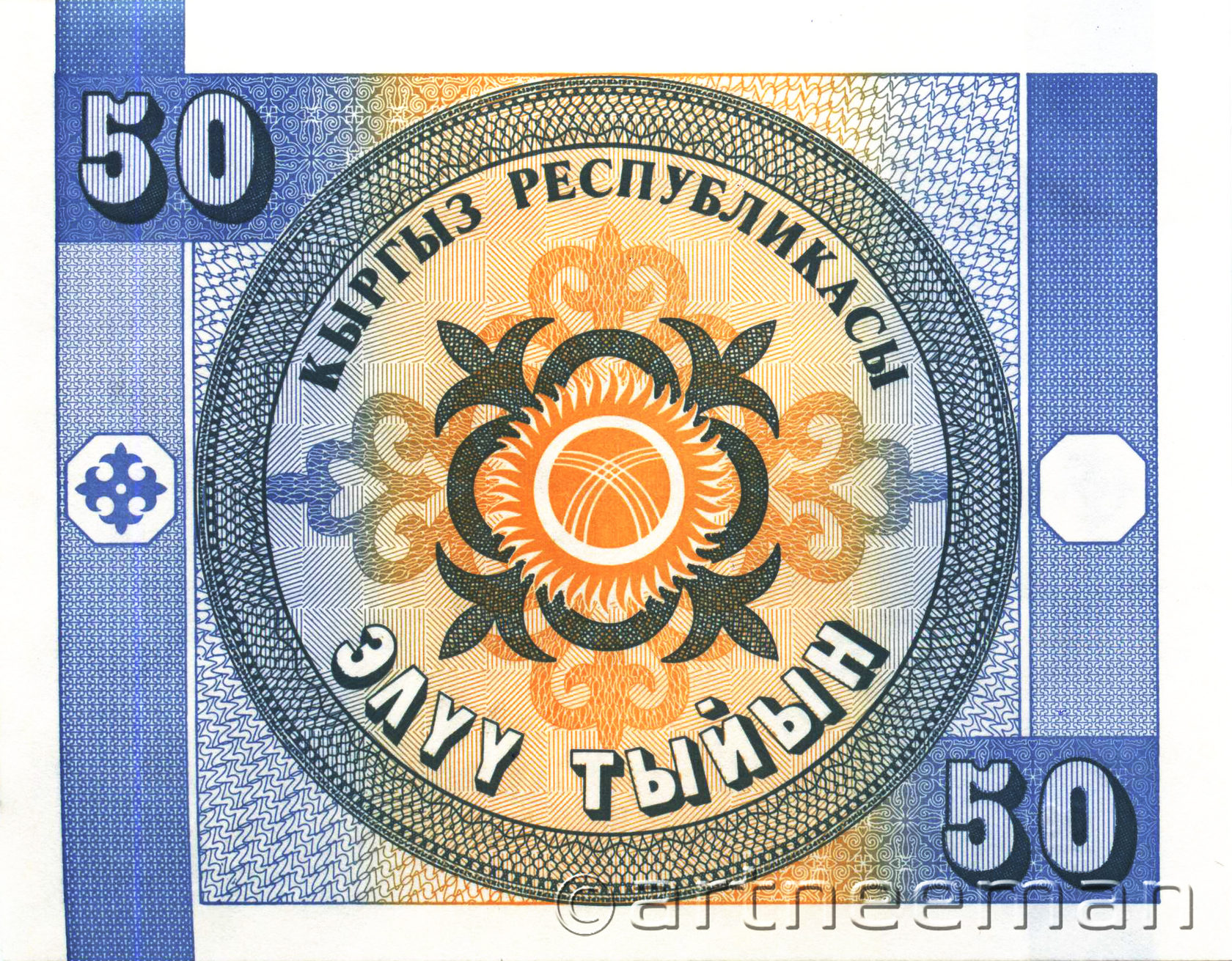Оборотная сторона: В левом верхнем и правом нижнем углу изображен цифровой номинал банкноты - число 50. В центре - изображение национальной символики (солнца, түндүк) в орнаментальном круге. В круге находится надпись "Кыргыз Республикасы" и словесный номинал "Элүү тыйын". По краям орнаментального круга расположен микротекст "Кыргыз Республикасы". Слева и справа от изображения беркута расположен сквозной регистр.