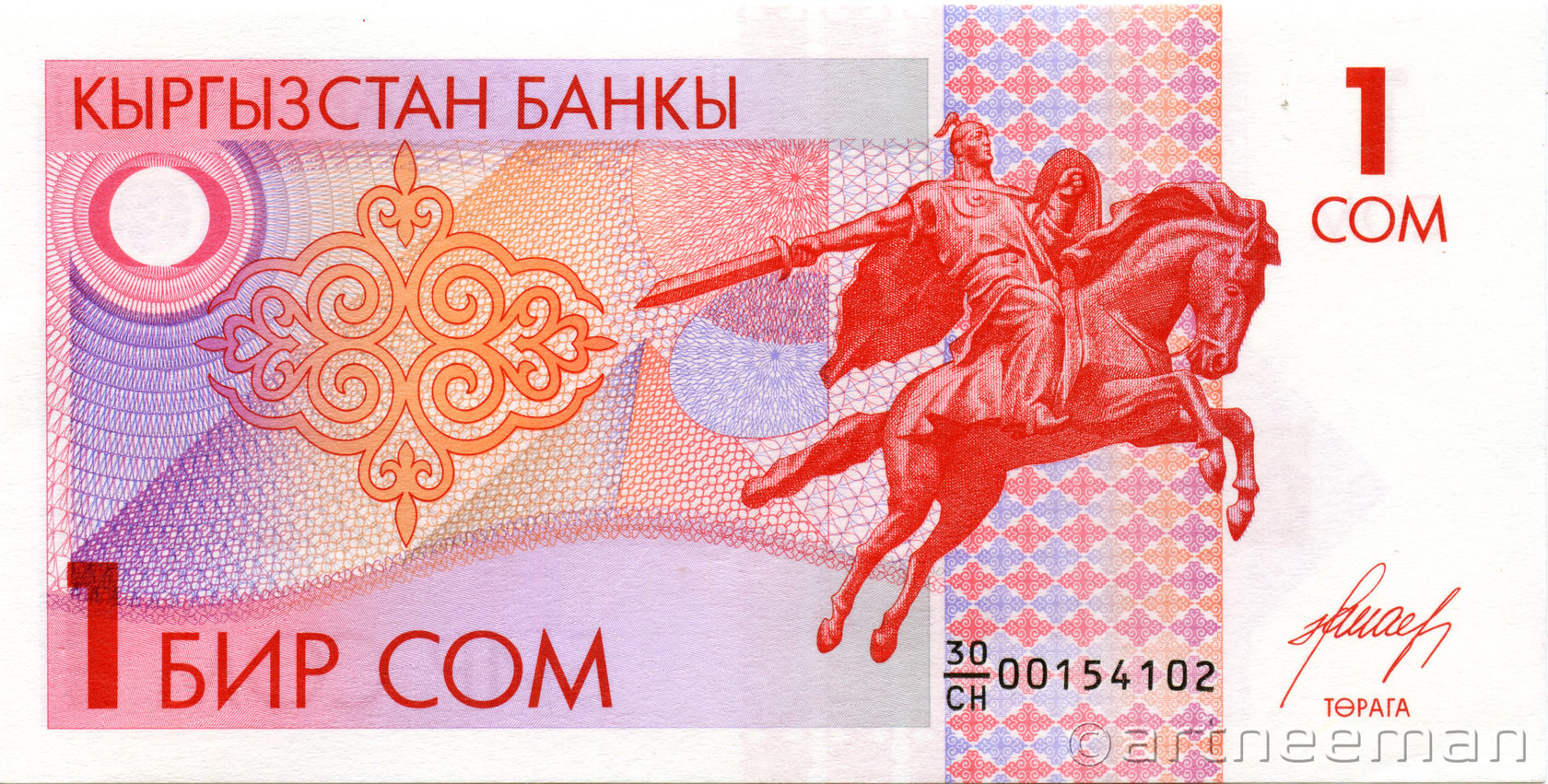 Лицевая сторона: Вверху находится текст "КЫРГЫЗСТАН БАНКЫ" и цифра с надписью "1 СОМ". В центре слева расположен сквозной регистр и национальный орнамент; справа - изображение памятника герою народного эпоса Манас. Внизу расположена цифра "1"; текст "БИР СОМ"; серия и номер банкноты, отпечатанные черной краской. Серия состоит из одной цифры и двух букв, номер - из восьми цифр. На белом купонном поле находится подпись Председателя (Төрага) НБКР.