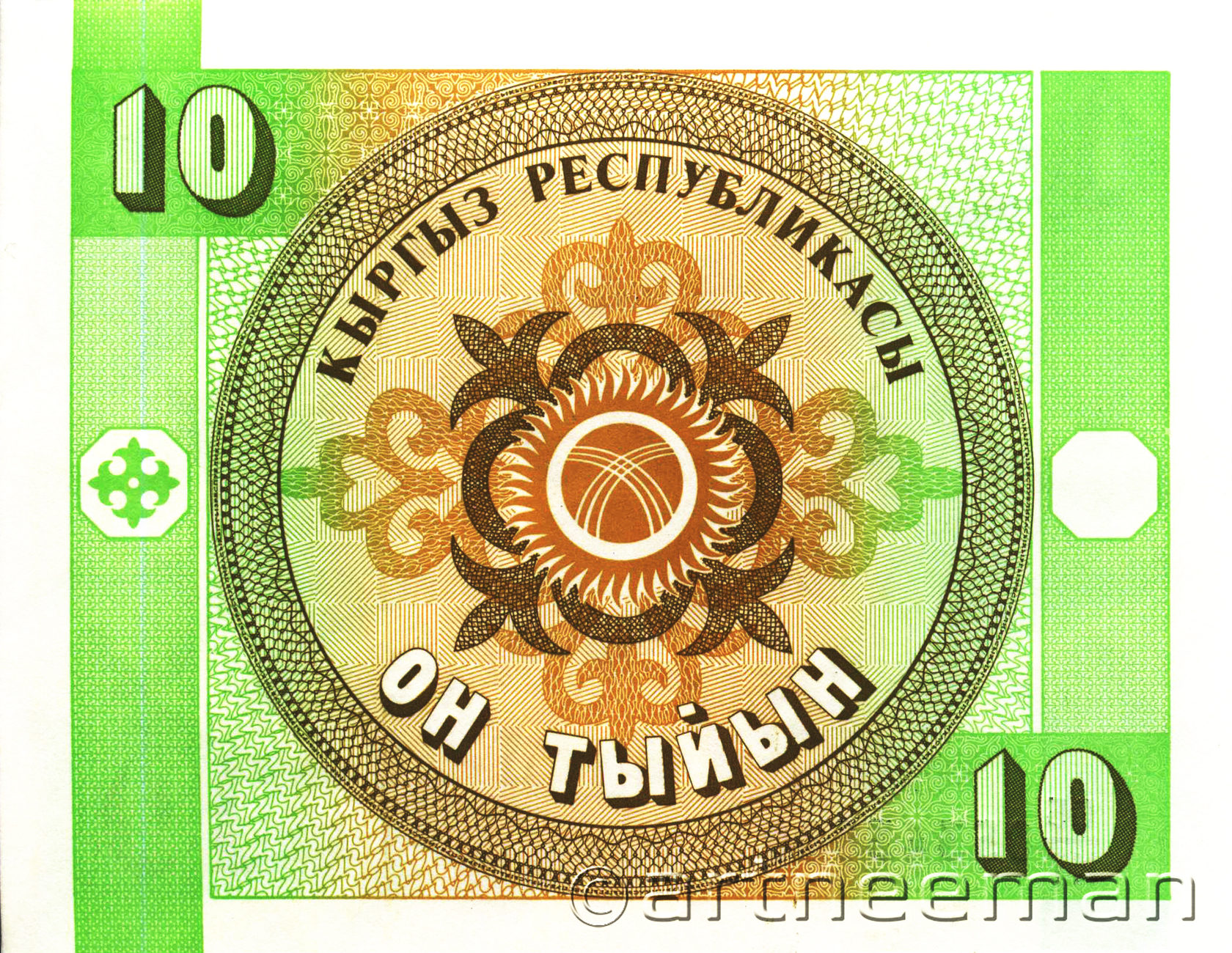 Оборотная сторона: В левом верхнем и правом нижнем углу изображен цифровой номинал банкноты - число 10. В центре - изображение национальной символики (солнца, түндүк) в орнаментальном круге. В круге находится надпись "Кыргыз Республикасы" и словесный номинал "Он тыйын". По краям орнаментального круга расположен микротекст "Кыргыз Республикасы". Слева и справа от изображения беркута расположен сквозной регистр.