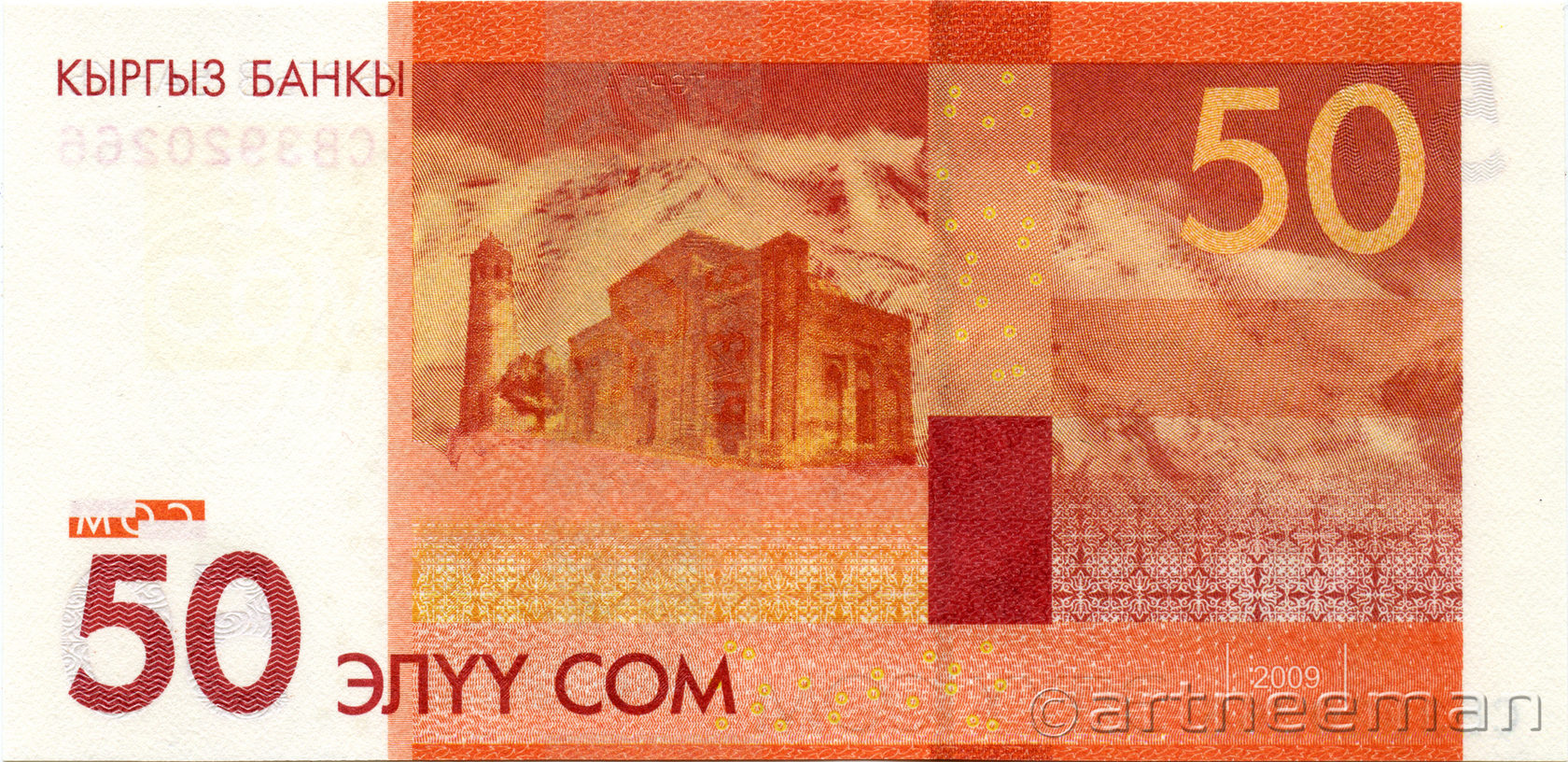 Оборотная сторона: Вверху банкноты находится надпись “КЫРГЫЗ БАНКЫ”. В правом верхнем углу расположены цифры номинала “50”. В центре банкноты изображен Узгенский архитектурный комплекс, одно из древнейших сооружений Великого шелкового пути в Кыргызстане. Основное сюжетное изображение состоит из стилизованных микроизображений растений. Каждый архитектурный памятник на банкнотах всей серии расположен на фоне красивейших вершин Кыргызстана, символизирующих, что персонажи, изображенные на банкнотах, достигли вершин в своей деятельности – литературе, музыке, кино, художественном искусстве. В центре банкноты находится иридесцентная (выполненная полупрозрачной блестящей краской) полоса с повторяющимся номиналом “50” и надписью “КЫРГЫЗ БАНКЫ”. Внизу банкноты расположен цифровой номинал “50”, текст “ЭЛYY СОМ” и год выпуска банкноты “2009”.