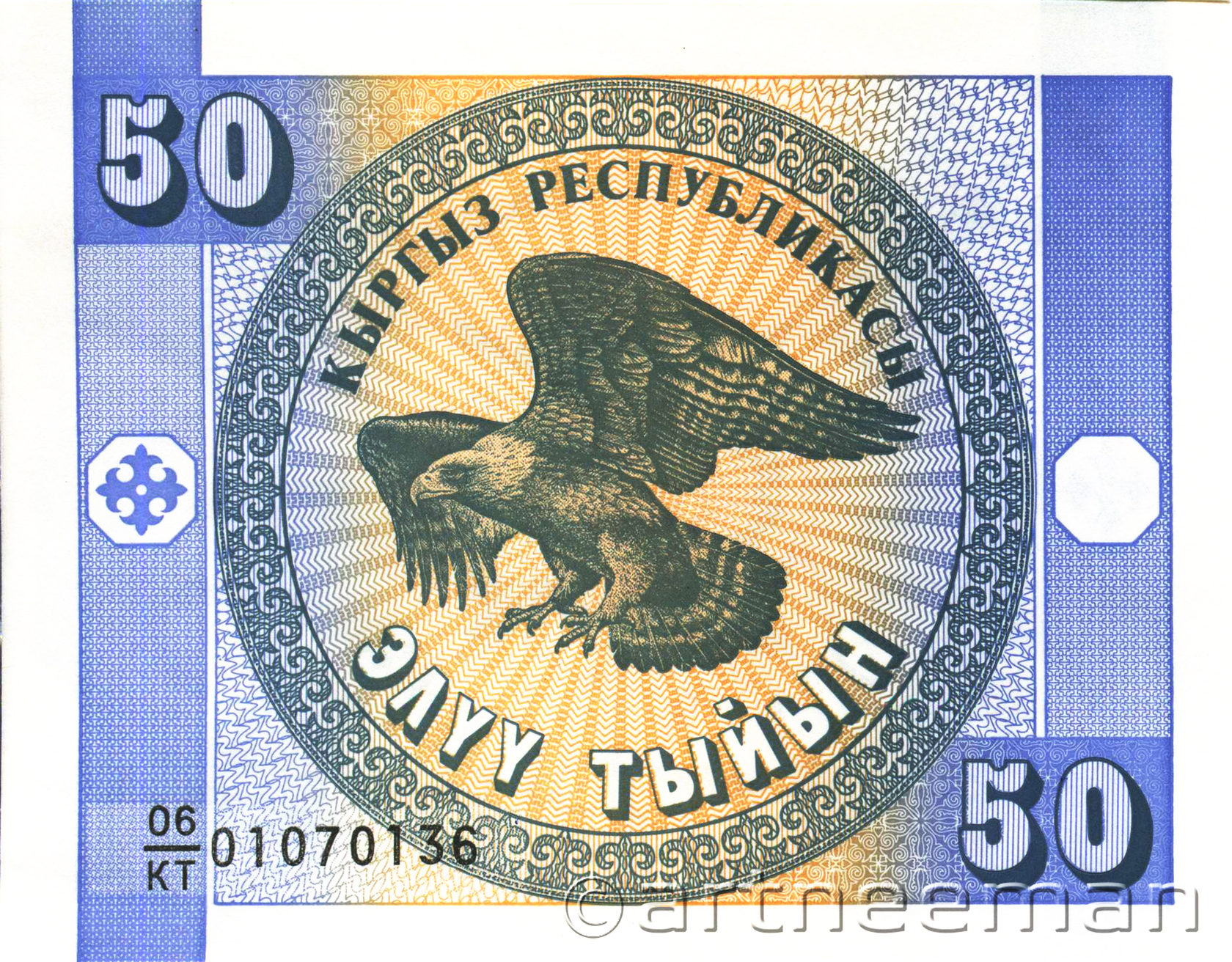 Лицевая сторона: В левом верхнем и правом нижнем углу изображен цифровой номинал - число 50. В центре -парящий беркут на фоне солнечных лучей в орнаментальном круге. В круге находится надпись "Кыргыз Республикасы" и словесный номинал "Элүү тыйын". По краям орнаментального круга расположен микротекст "Кыргыз Республикасы". Слева и справа от изображения беркута расположен сквозной регистр. В правом нижнем углу расположены серия и номер банкноты, отпечатанные черной краской. Серия состоит из одной цифры и двух букв, номер - из восьми цифр.